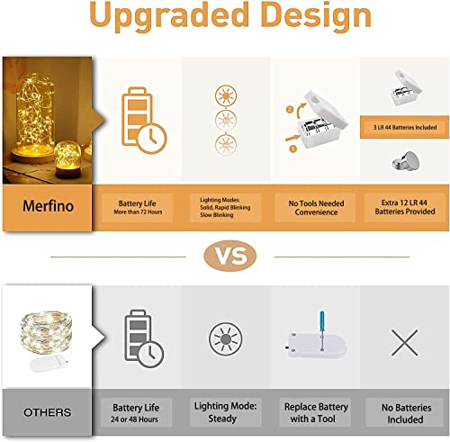 - š48 Batteries Included, Long-lasting & Energy-saving: Each fairy lights includes 3* LR 44 batteries, providing more than 72 Hours of battery life, longer working time than other's 24 or 48 hours fairy string lights. Besides, the twinkle lights also comes with 12 extra LR 44 batteries for replacement. (Please note that the batteries need to be replaced when the lights get dim.)