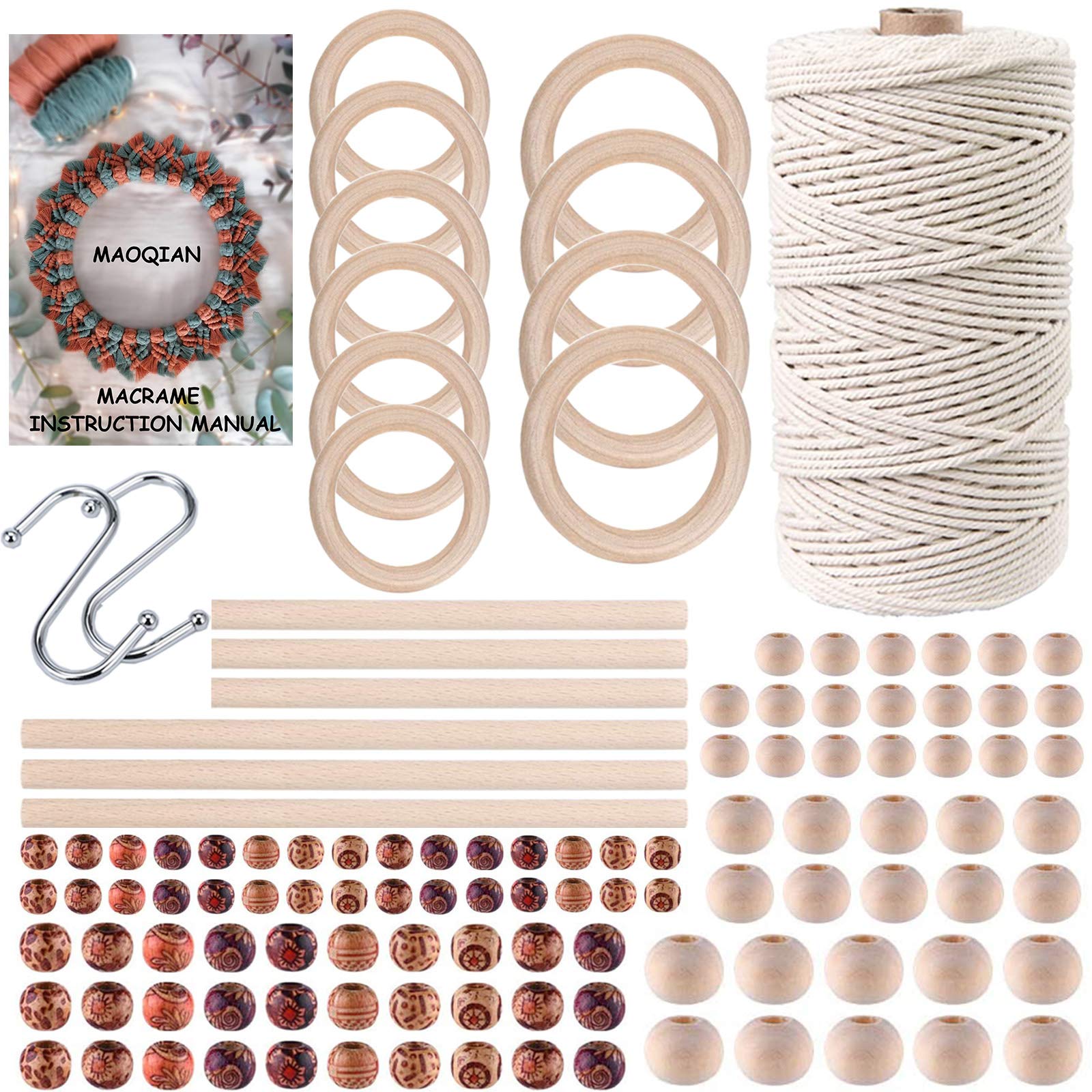 - All In One Macrame Kits (120pcs) : All Macrame supplies include such as 1 roll 3mm x 109 yard natural cotton macrame rope, 1pc macrame instruction manual, 6pcs wooden sticks (3pcs 10mmx15cm and 3pcs 10mmx20cm), 10pcs wooden rings (6pcs 50mm and 4pcs 70mm), 40pcs wood beads (20pcs 15mm and 10pcs 20mm and 10pcs 25mm), 60pcs painted wood beads (30pcs 12mm and 30pcs 17mm),2pcs silver S hooks, great for macrame and knotting beginners.