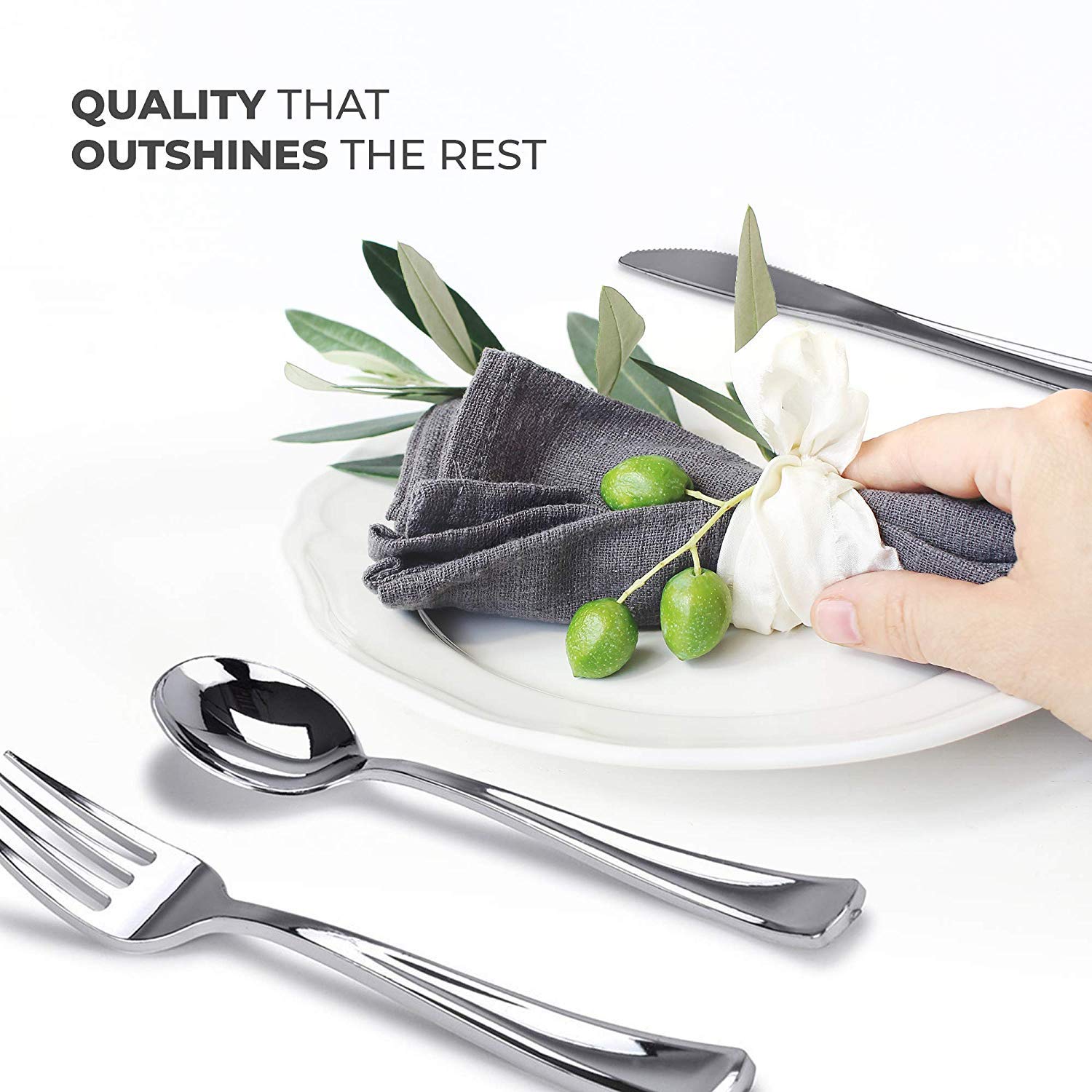- BPA FREE DISPOSABLE CUTLERY: Feel the quality by the weight of it in your hand. The sleek silver finish will outshine any white or clear plastic flatware set elevating your table setting with stunning silver flatware that will complement any party theme. Same as real silverware, these plastic eating utensils are not microwaveable. However, they are disposable making the cleaning process less of a hassle.