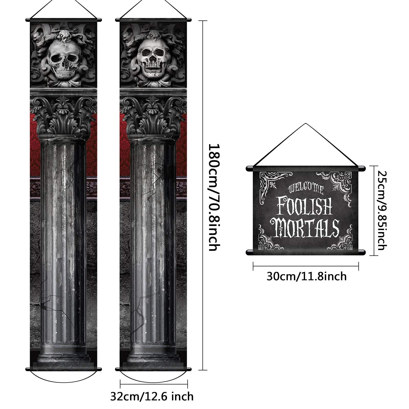 2 Pieces Halloween Gothic Mansion Banners Halloween Skull Hanging Banners with Welcome Foolish Mortals Porch Sign Spooky Pillar Sign Decorations for Outdoor Party Supplies