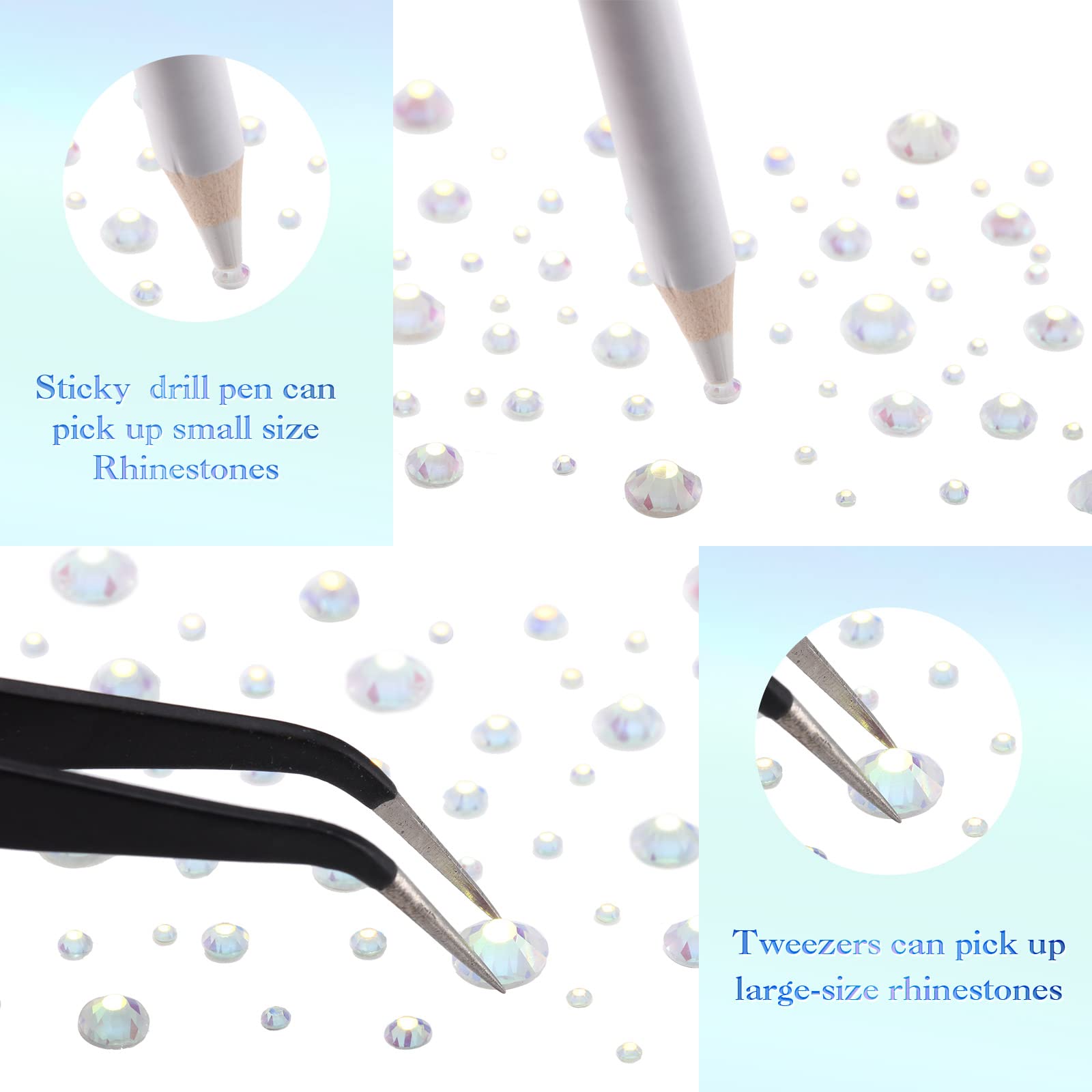 - Crystal rhinestones with tools: package includes 2000 pieces rhinestones in 6 sizes, with quality tweezer and pick up pen; The rhinestones are not hotfix and need glue to stick them (glue is not included