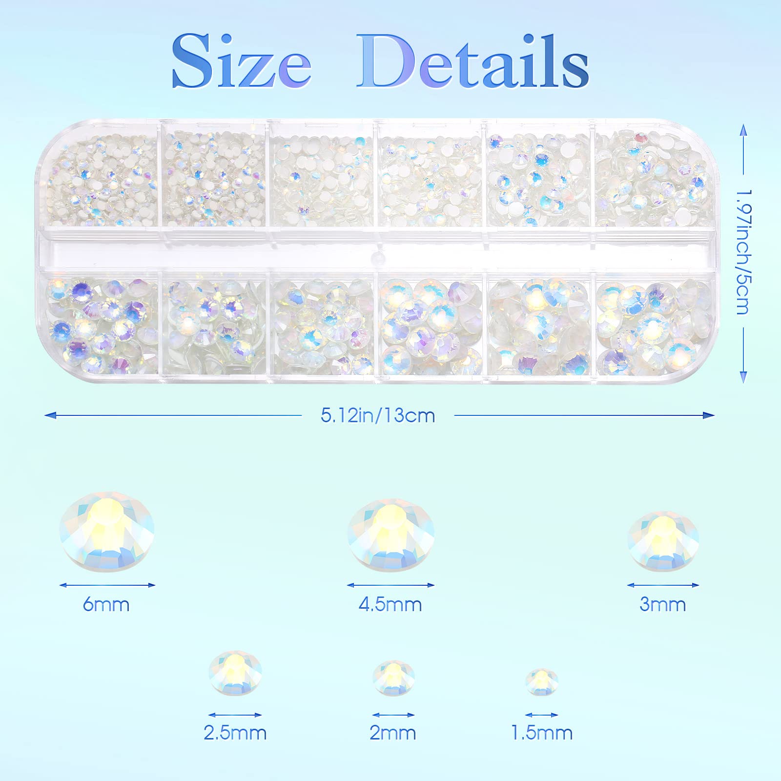 - 6 Sizes rhinestones in the box with 12 grids: they are 1.5 mm (600 pieces), 2 mm (584 pieces), 2.5 mm (300 pieces), 3 mm (300 pieces), 4.5 mm (144 pieces), 6 mm (72 pieces)