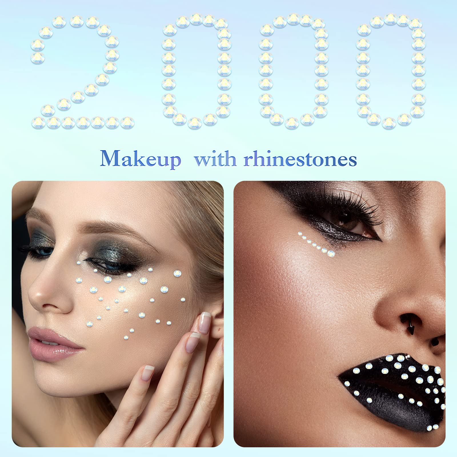 - Wide rang of usages: 2000 pieces rhinestones are enough for decorating your nail, eye makeup, body art, phone, bags, greeting cards, clothes, high mesh stockings, shoes, wedding dress, books, guitar, tablets, car plates, table scatter or other items