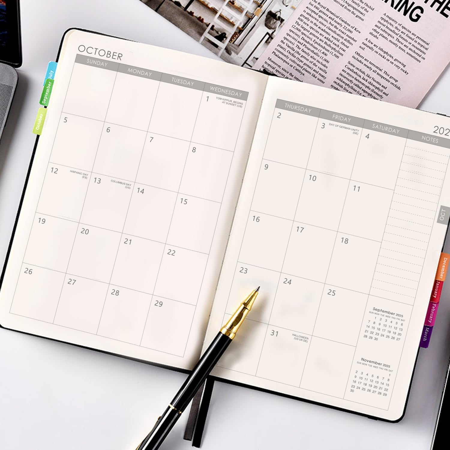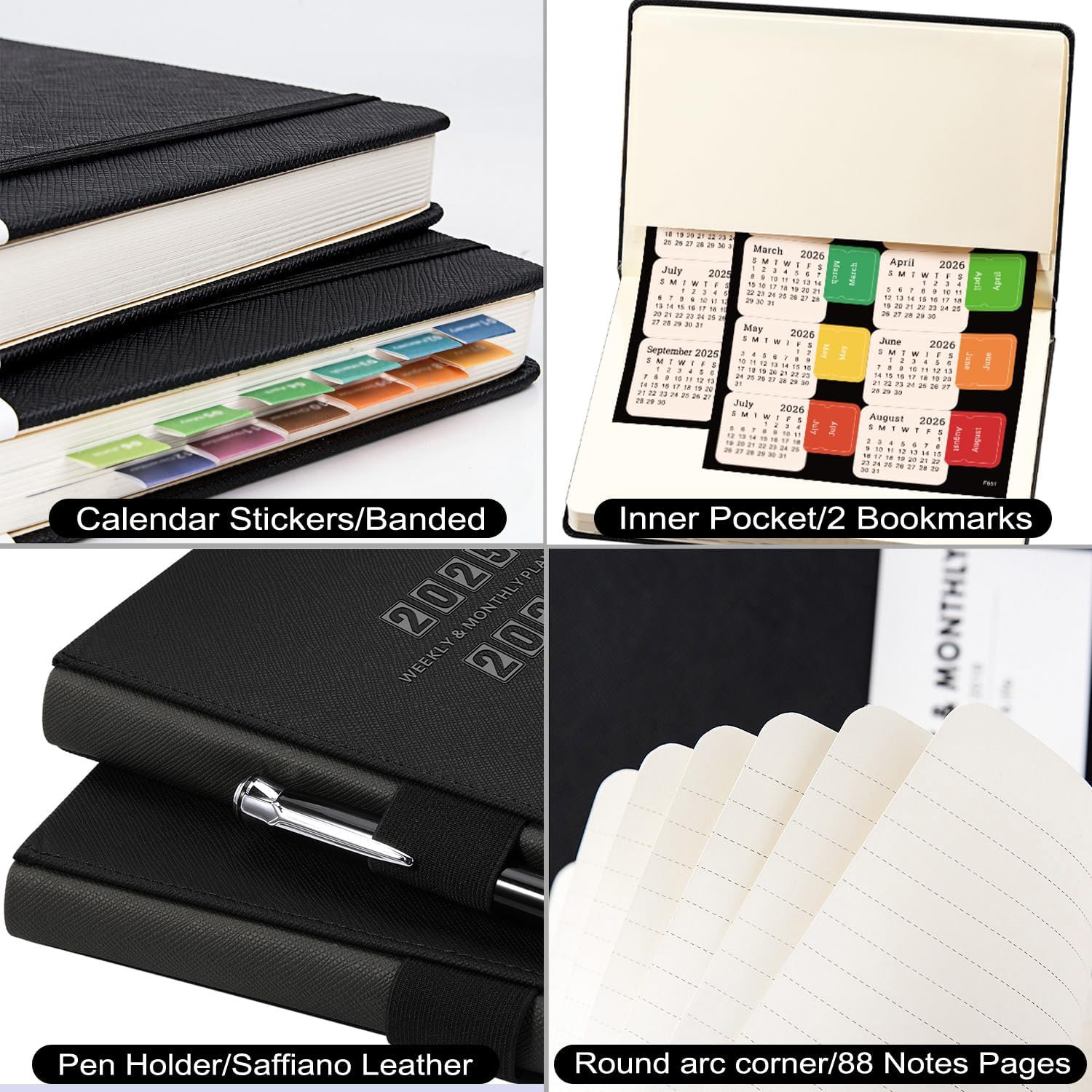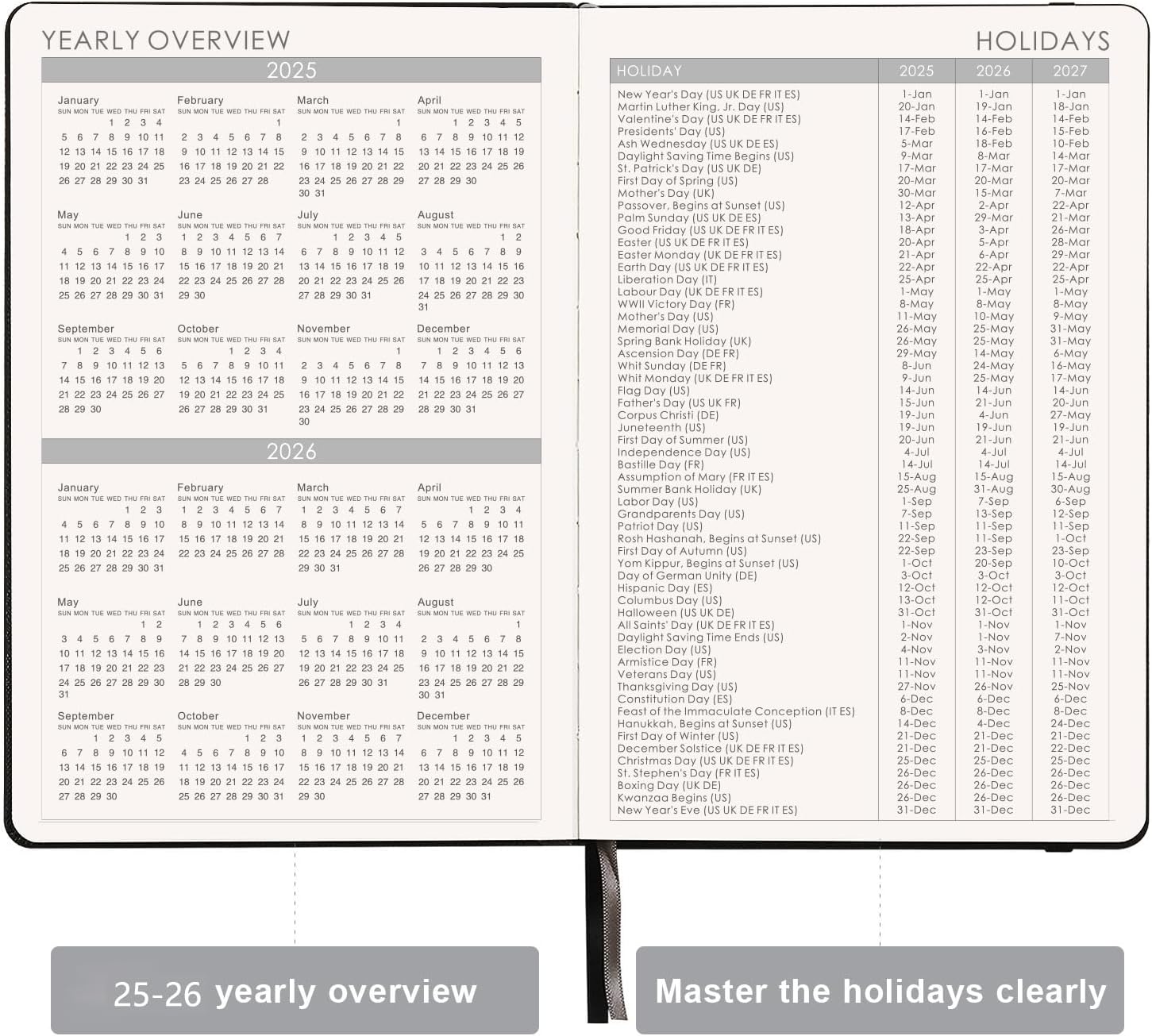 Durable saffiano leather cover, excellent texture. 2025-2026 yearly holidays lets you master the holidays clearly. The planner offers unruled monthly pages/ruled weekly layouts for detailed planning.
