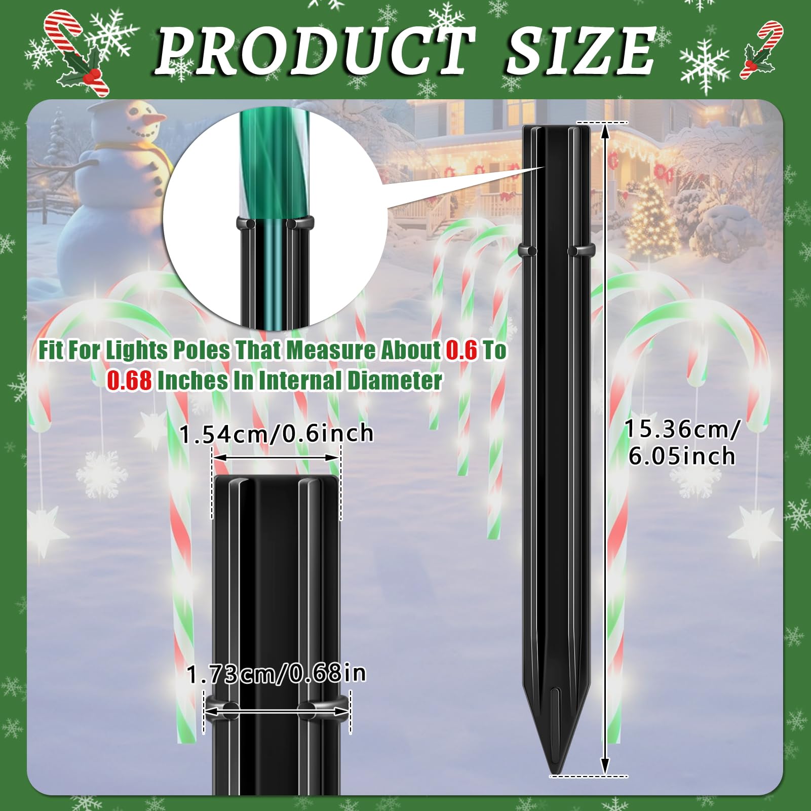 - Size Information:Stakes for Candy Cane Lights measure about 0.68 x 6.05 inches, fit for lights poles that measure about 0.6 to 0.68 inches in internal diameter; Please check the size information before purchasing the product.