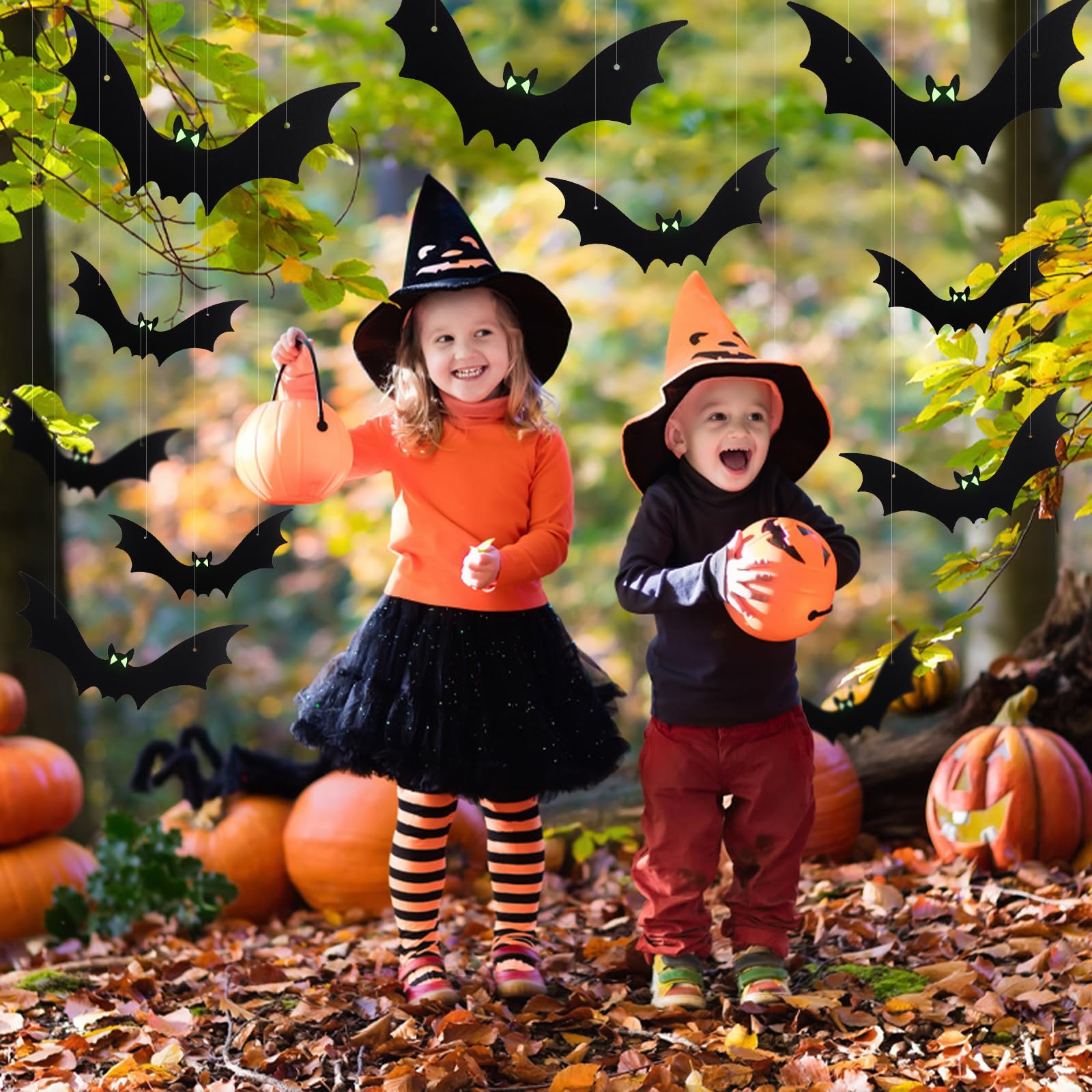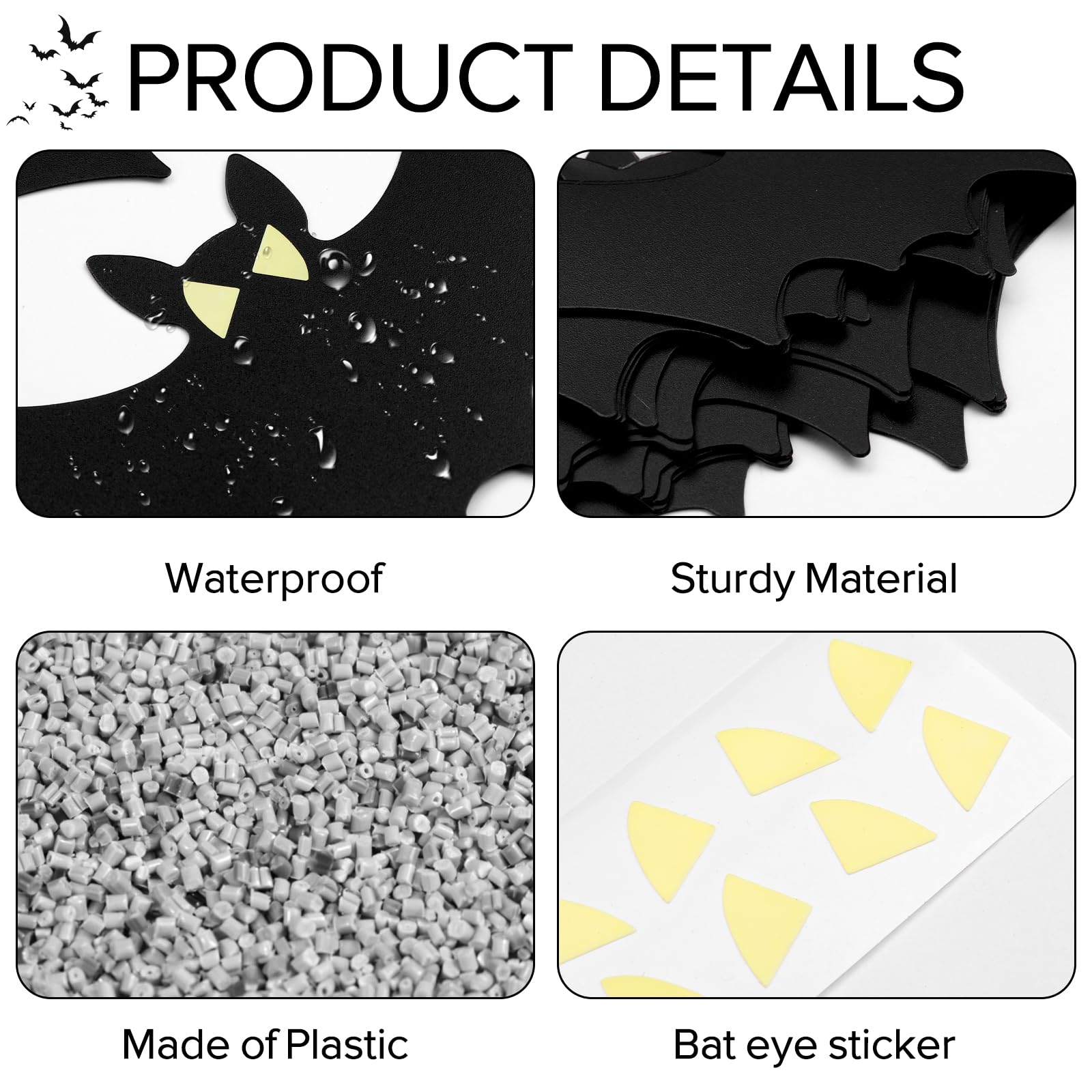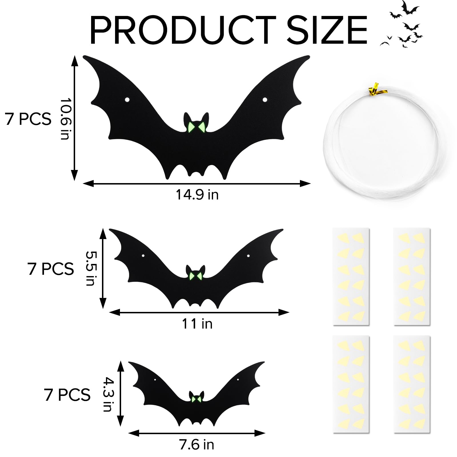 - Great Value Pack:You will receive 21 pieces Halloween hanging bat of 3 sizes(15"x10.6”", 11"x3.5"and 7.6"x4.3"), 24 pairs glow in the dark bat eye stickers and a roll of string.