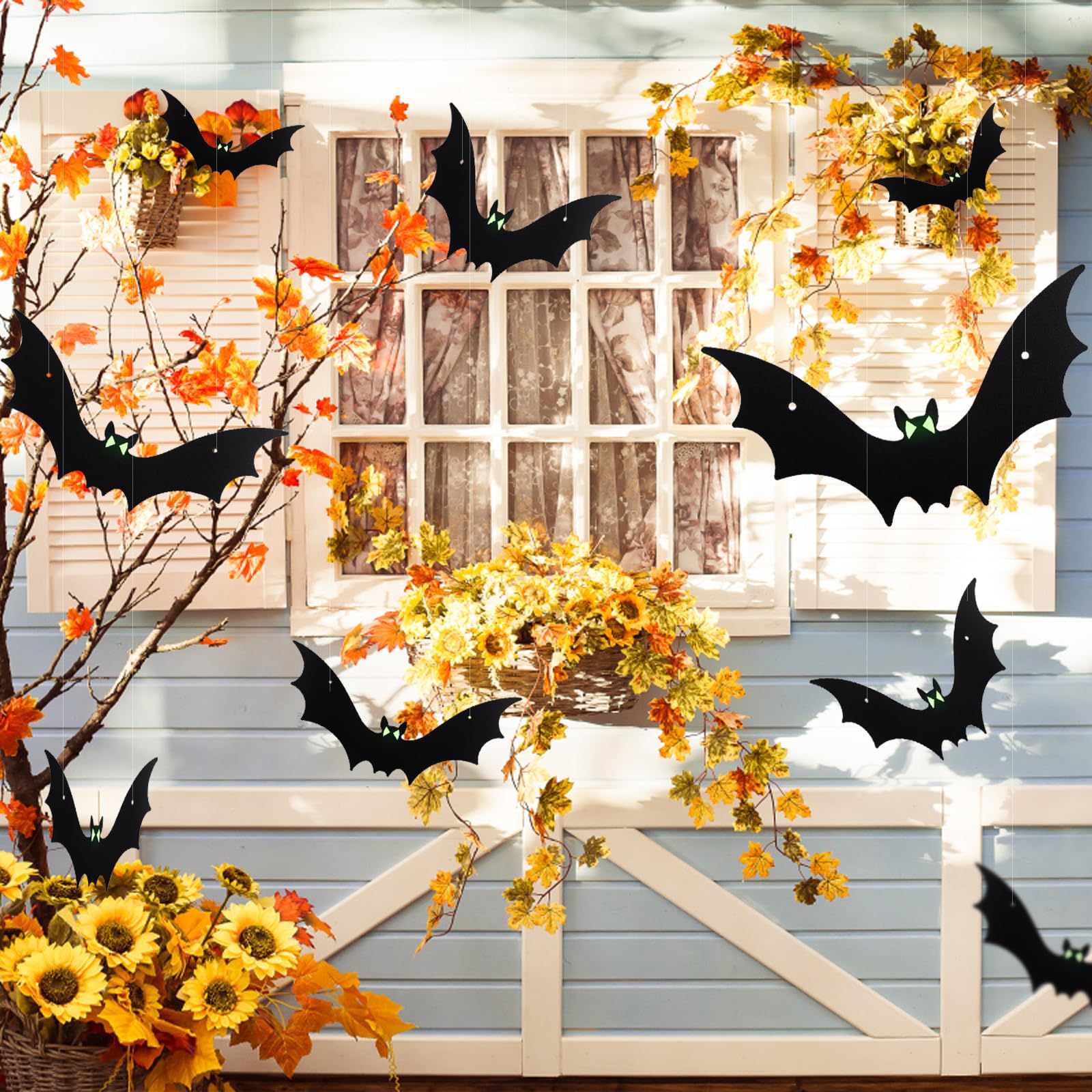 21pcs Halloween Hanging Bats Large Flying Bats Outdoor Decorations Fake Black Bats with Glow in the Dark Eyes for Halloween Outside Tree Yard Porch Decor Supplies