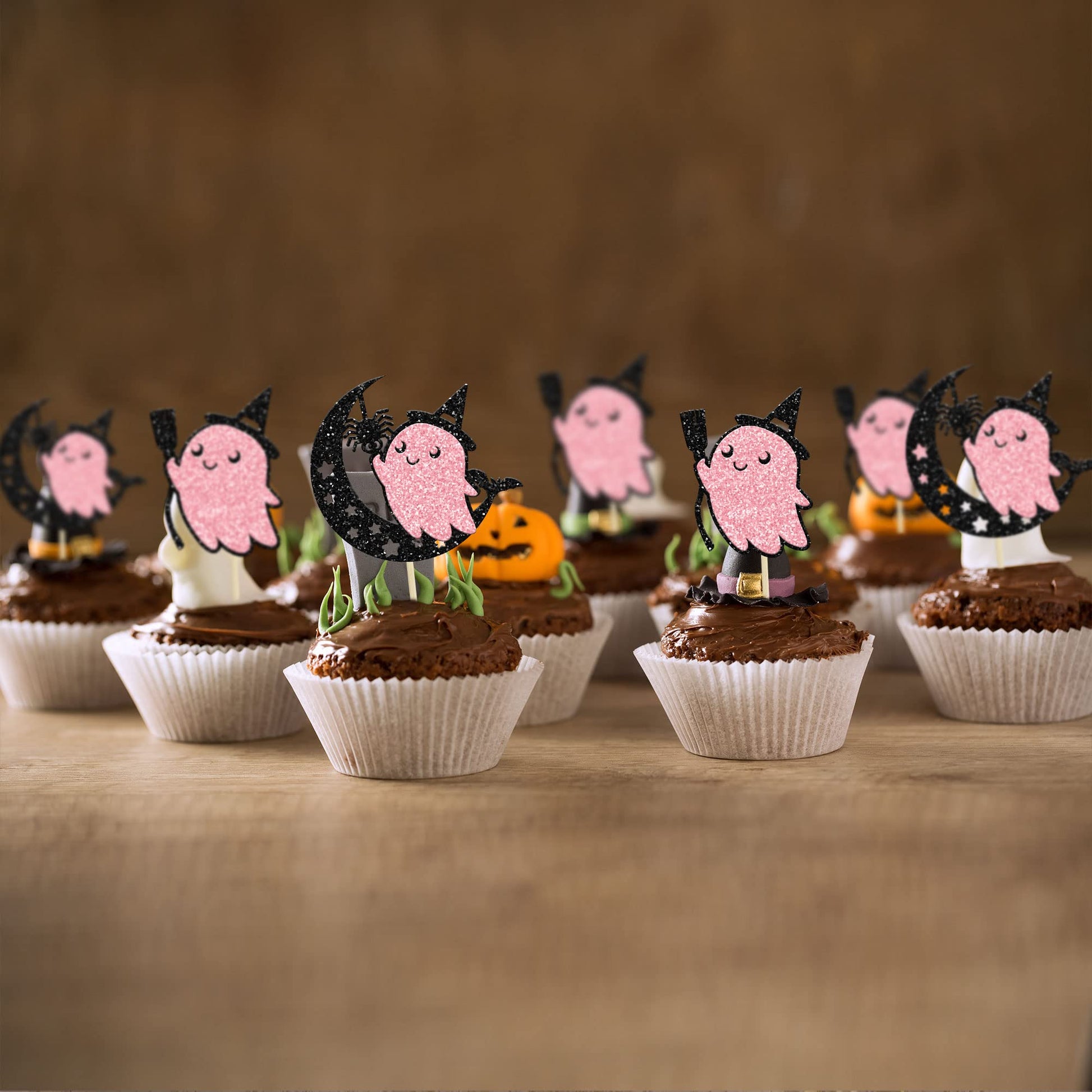 24Pcs Pink Halloween Cupcake Toppers Pink Ghost Little Boo Cake Toppers Decorations for Pink Girl Halloween Birthday Baby Shower Party Supplies