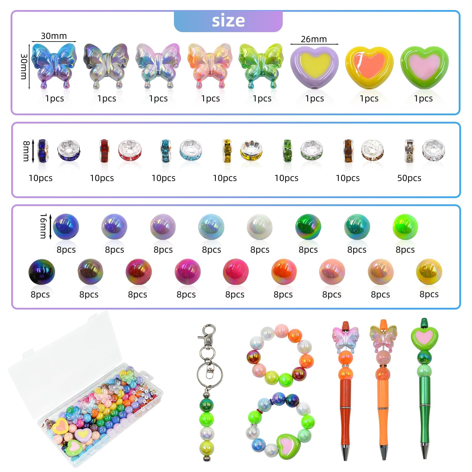 - 【Products Size】There are 3 styles of assorted beads in different sizes. The diameter of the ball beads is about 16mm and the hole size is about 3mm. The butterfly-shaped beads are 30mm long. The heart-shaped beads are about 2.6mm. They are suitable for most jewelry beads, acrylic beads and beadable pens beads making. Focal beads for pens bulk kit diverse range ensures there are beads to match any aesthetic or occasion. craft supplies for adults.