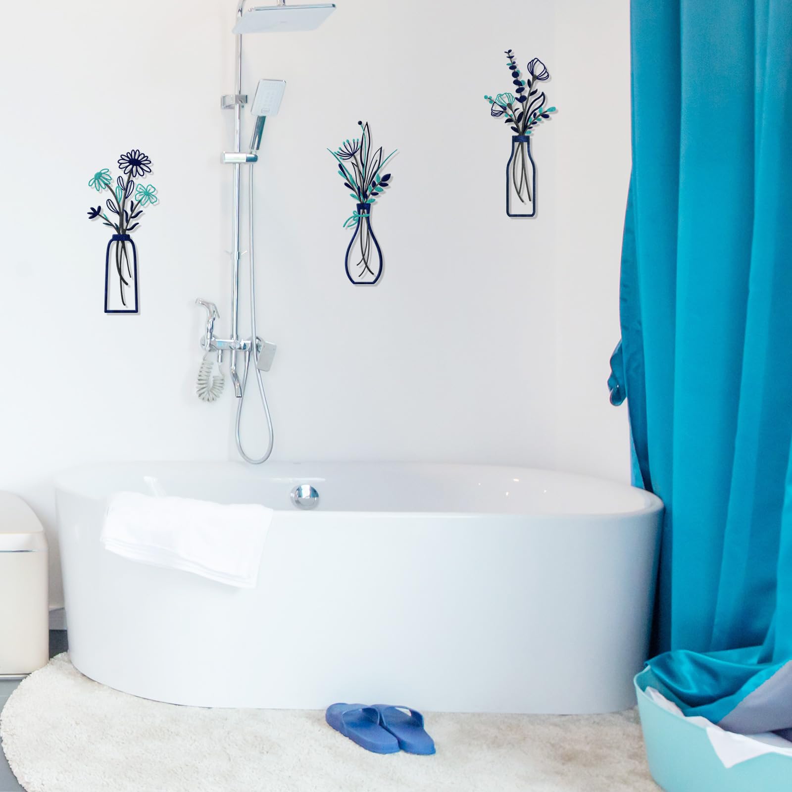 3 Pieces Metal Flowers Wall Arts - Rustic Farmhouse Style Décor Metal Wall Art Black Minimalist Flower Natural Themed Wall Decors for Home Bedroom Dining Room Housewarming (Blue)