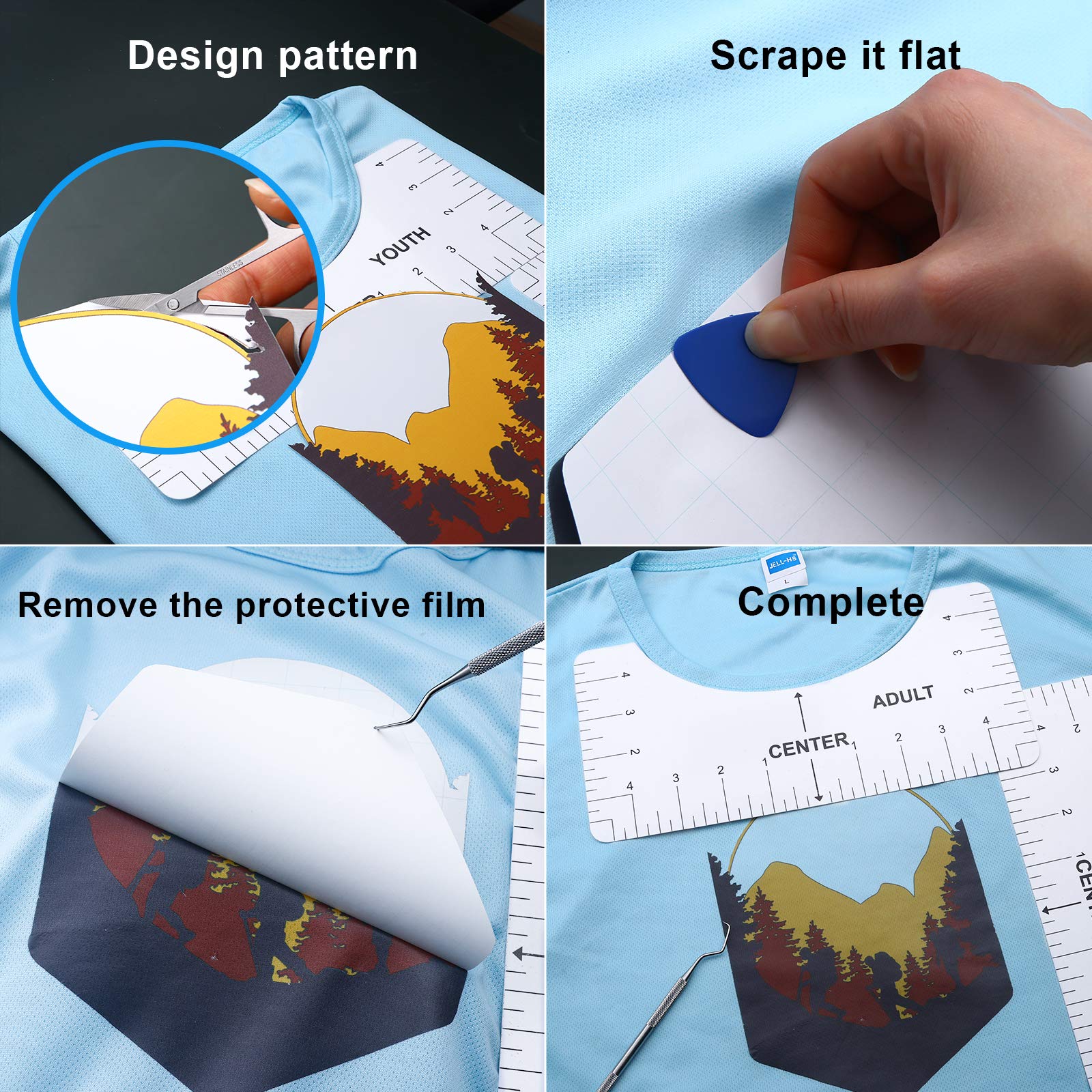 - 【VALUABLE PACKAGING】:2 PCS tweezers, a triangular slice,2 PCS spatula, a tracing Pen, 3 PCS hook weeder, a stainless steel scissors, an awl, 3 PCS scraper, 4 PCS T-Shirt alignment rules, 10 PCS blades, a carving knife, a cutting board.