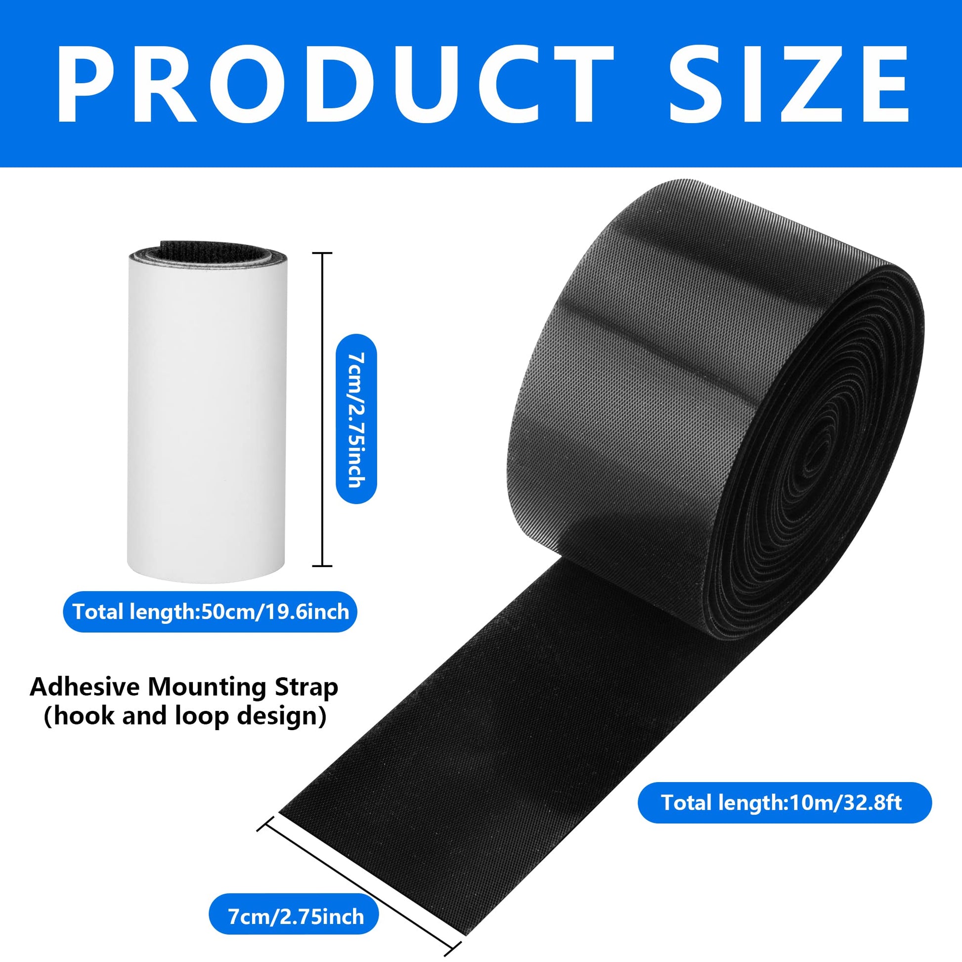 Size:Under couch blocker measures approx 32.8 x 0.23 feet, the adhesive mounting strap measures approx 16.4 x 0.23 feet.