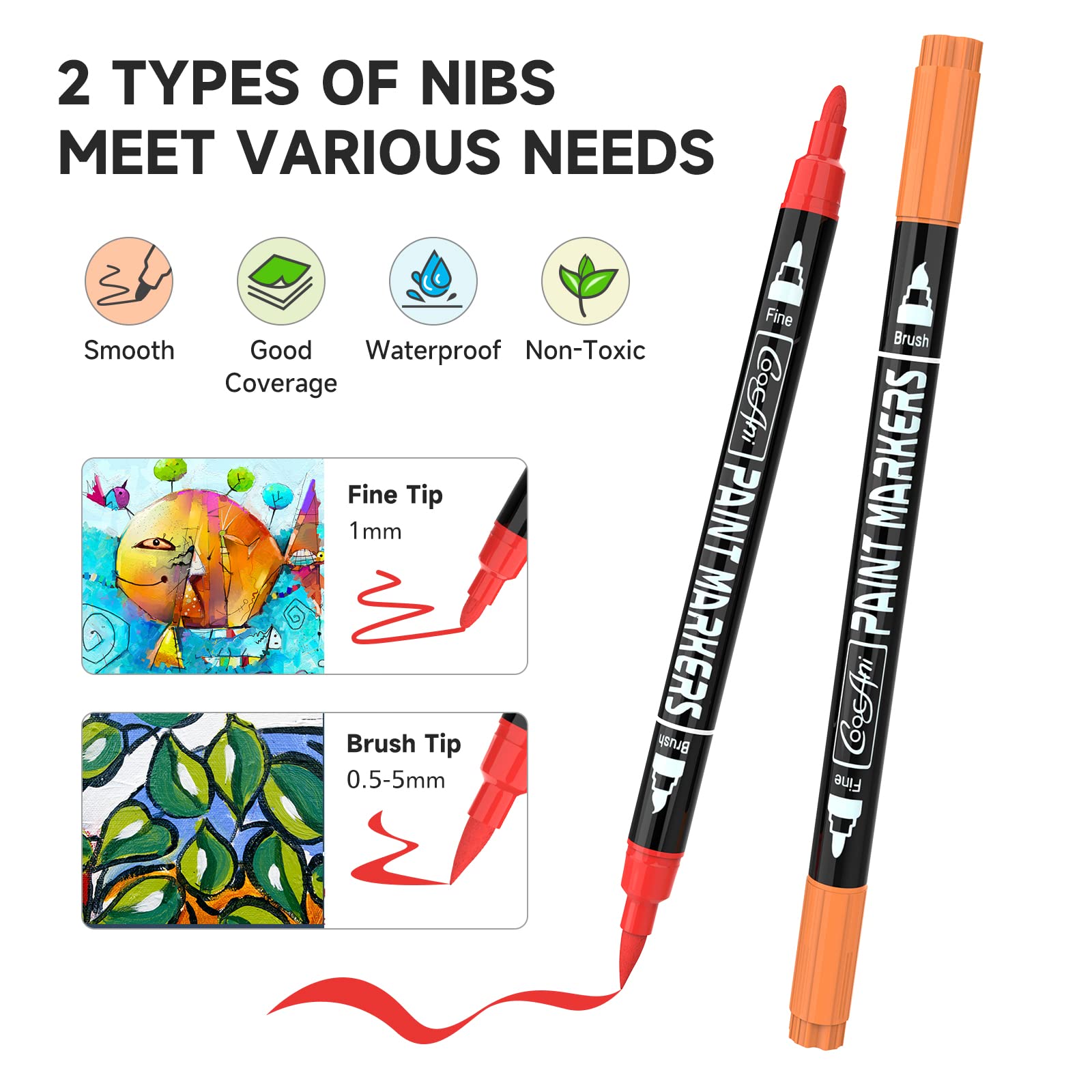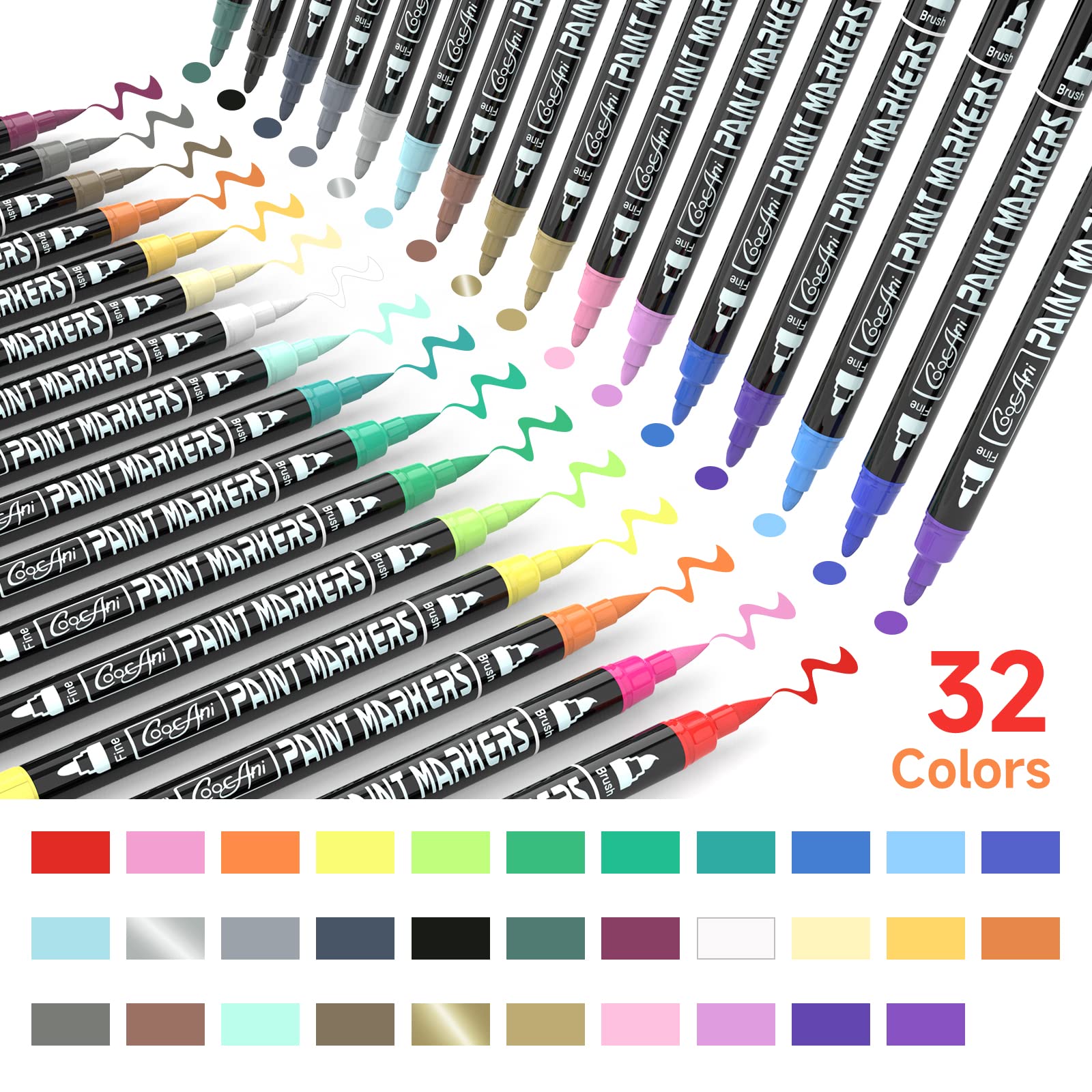 - ✎【Dual-Tip Design with 32 Colors】These paint markers are designed with unique dual-tip:1mm fine tip for precise application, and 0.5-5mm brush tip for large area coloring.And what's more,it comes with 32 vibrant colors, which offer a very wide range of options for your creative projects.