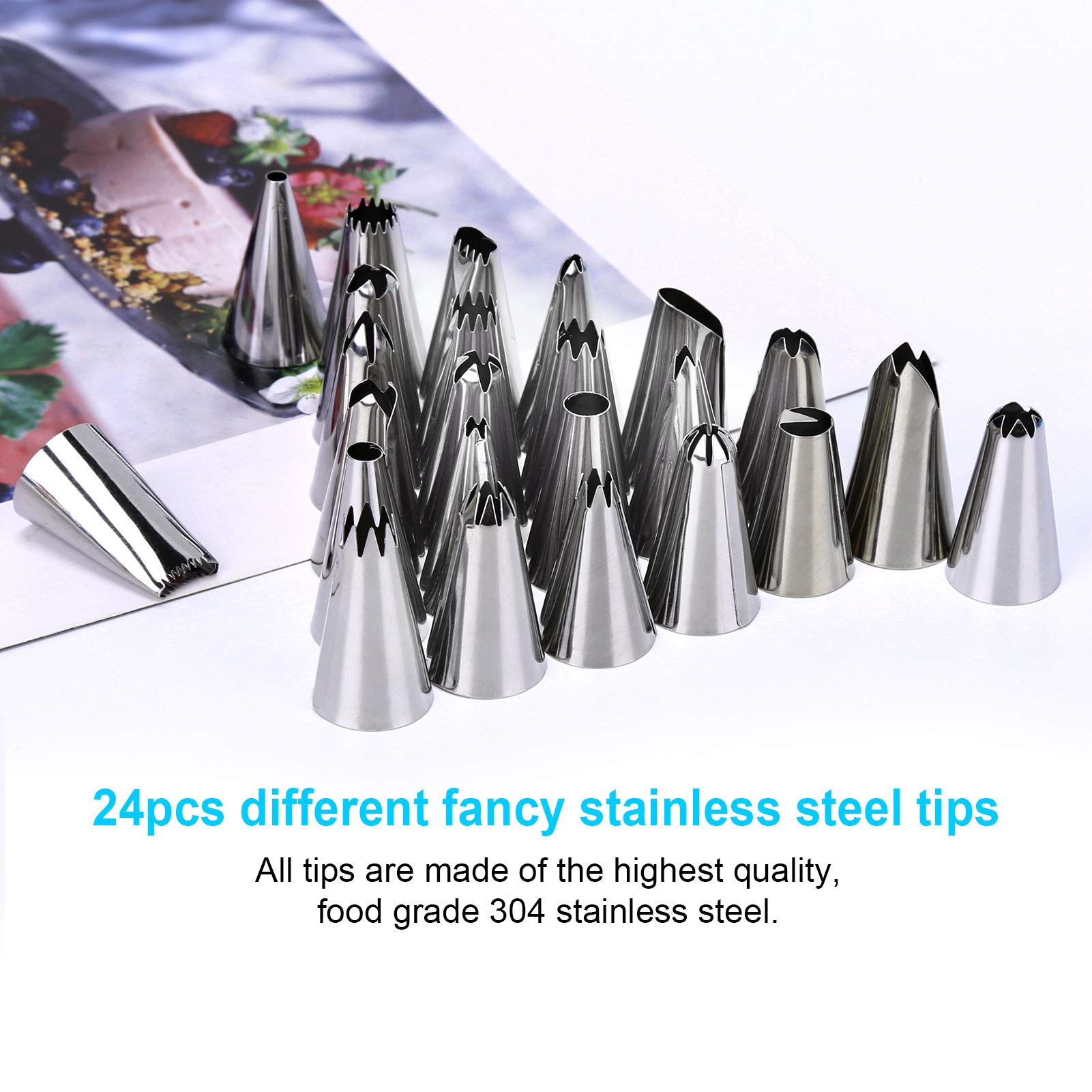 - 🍰【PERFECT SET MATCH 】 - 24 x different stainless steel icing tips, 2 x different size silicone pastry bags, 2 x reusable plastic couplers, 3 x plastic scrapers, 2 x frosting bags ties and 1 x Pipe Brush , our set can provide a full and necessary cake decorating tools set with which you can create differents types of patterns on cake.
