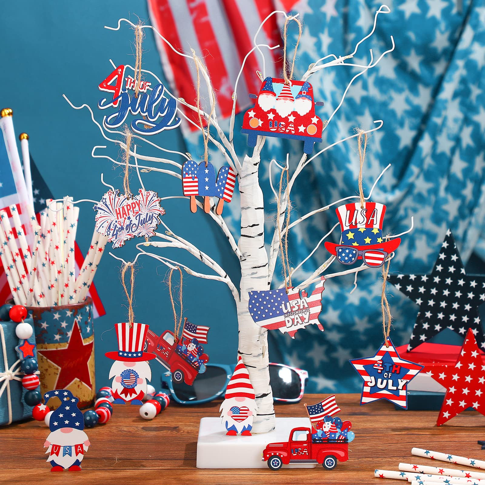 36 Pieces 4th of July Ornaments for Tree Independence Day Wooden Gnome Hanging Decor Red White Blue Wooden Decor Memorial Day Leprechaun Cutouts Pendant for Independence Day Party Home Supplies
