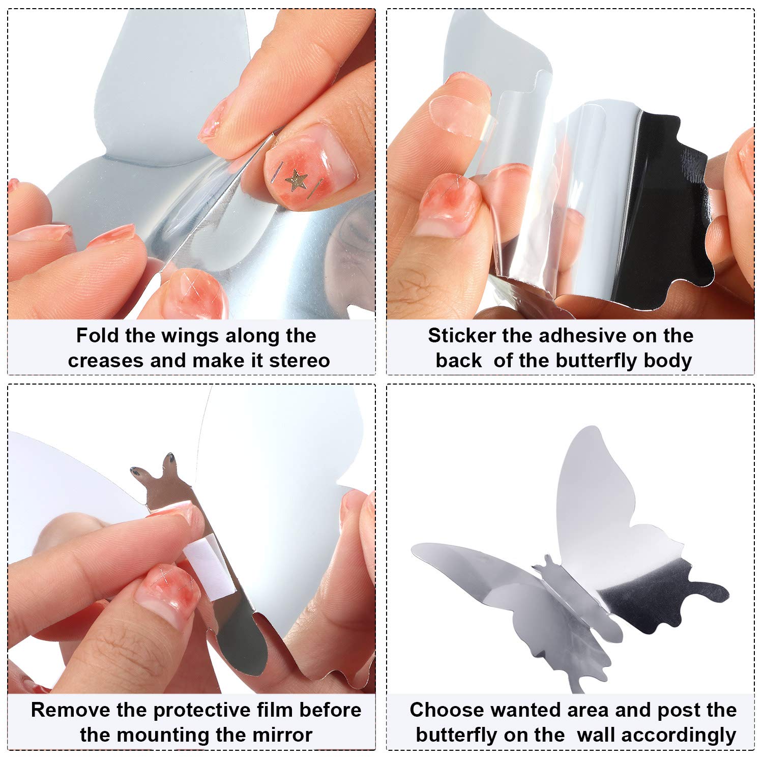 - What you can get: 1 set of mirror butterfly wall decals includes 4 pack of large (11 cm), 8 pack of middle (8 cm) and 36 pack of small (6.5 cm), 48 pieces of butterfly in total