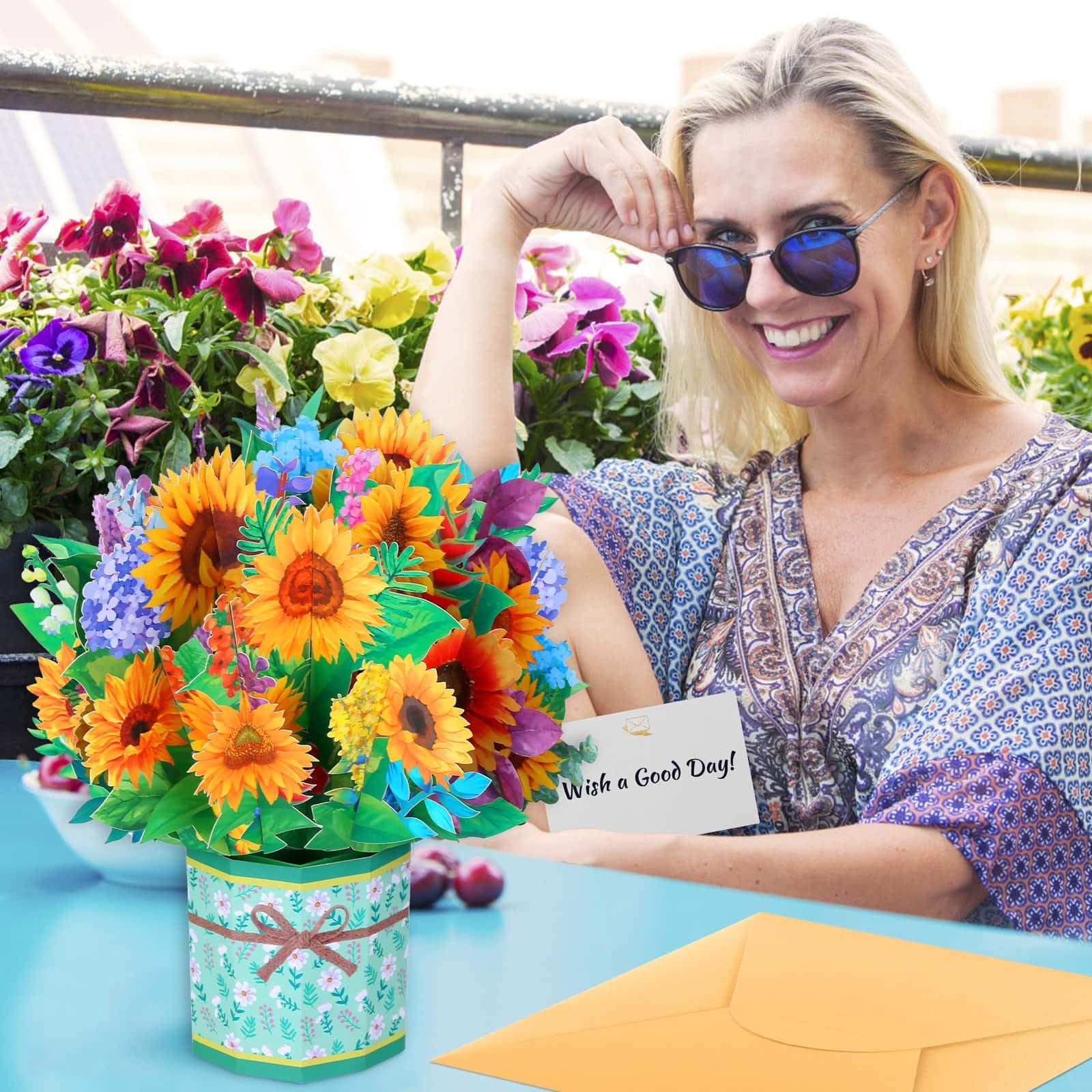 - Vivid Flower Bouquet Card - The 3d flower bouquet pop-up design, upon opening, a bunch of realistic fresh cut flower bouquets will appear; pop-up birthday cards for women, teacher gifts, and gifts for moms, and grandmas which is a wonderful and long-lasting alternative for fresh cut bouquet