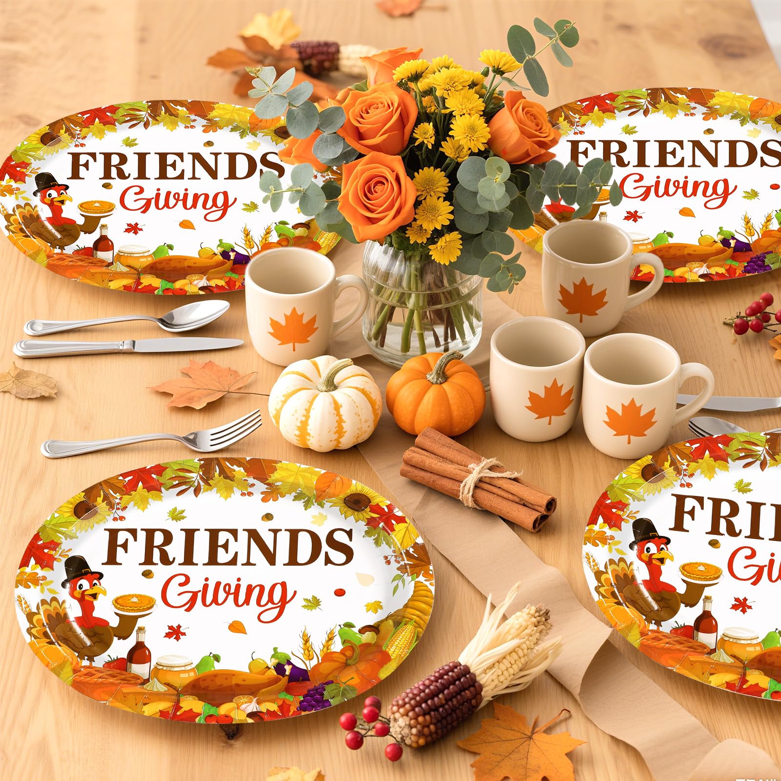 50Pcs Friendsgiving Oval Plates 10"x12" Large Fall Thanksgiving Turkey Paper Plates Disposable Heavy Duty Turkey Harvest Pumpkin Dinner Platter for Autumn Fall Friendsgiving Friends Thanks Party Decor