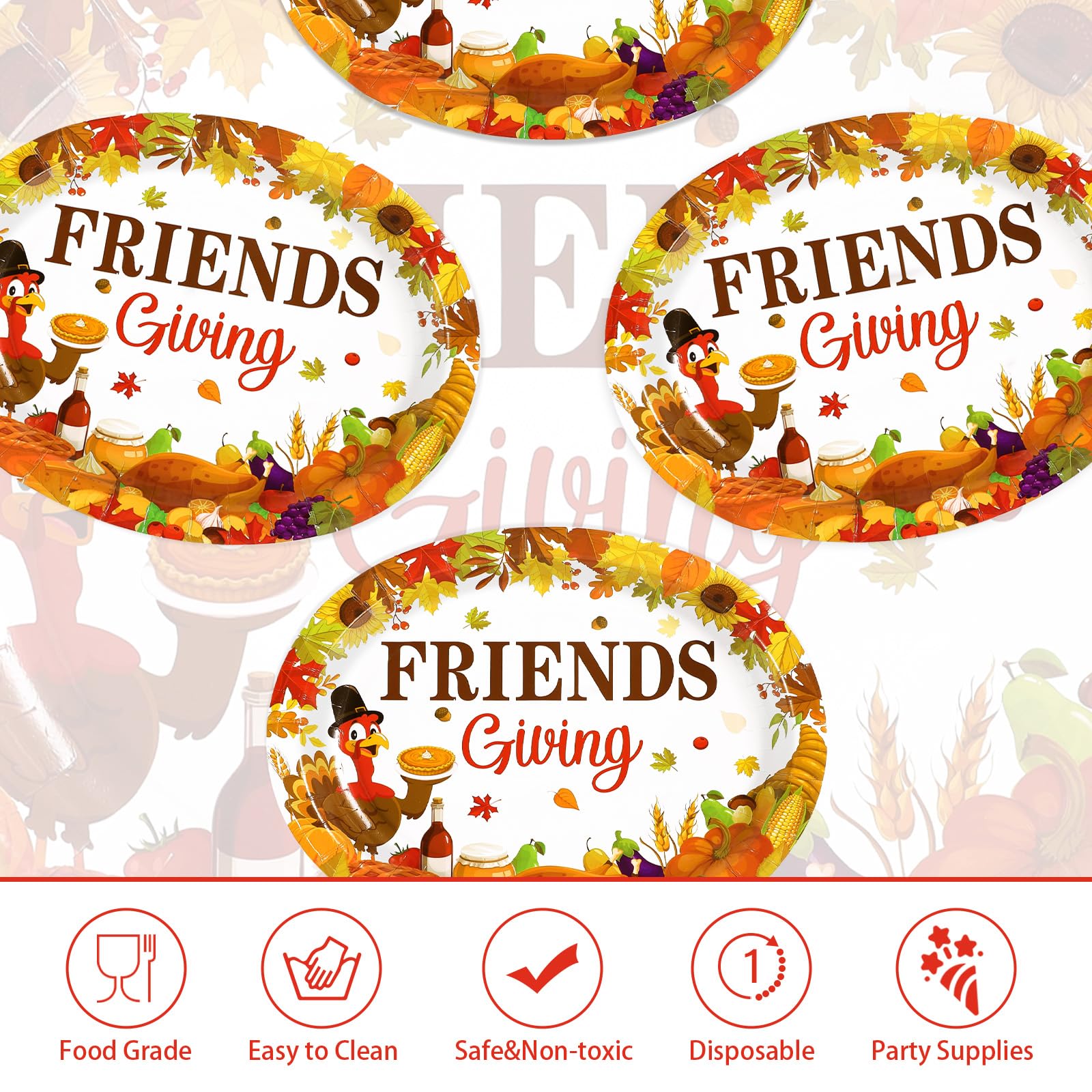 - Fall Friendsgiving Turkey Harvest Theme Design: Our fall turkey harvest paper plates feature a fall thanksgiving friends and turkey harvest theme, patterned with turkey, harvest crops, leaf elements, simple, stylish, and cute, embodying the essence of fall thanksgiving theme.