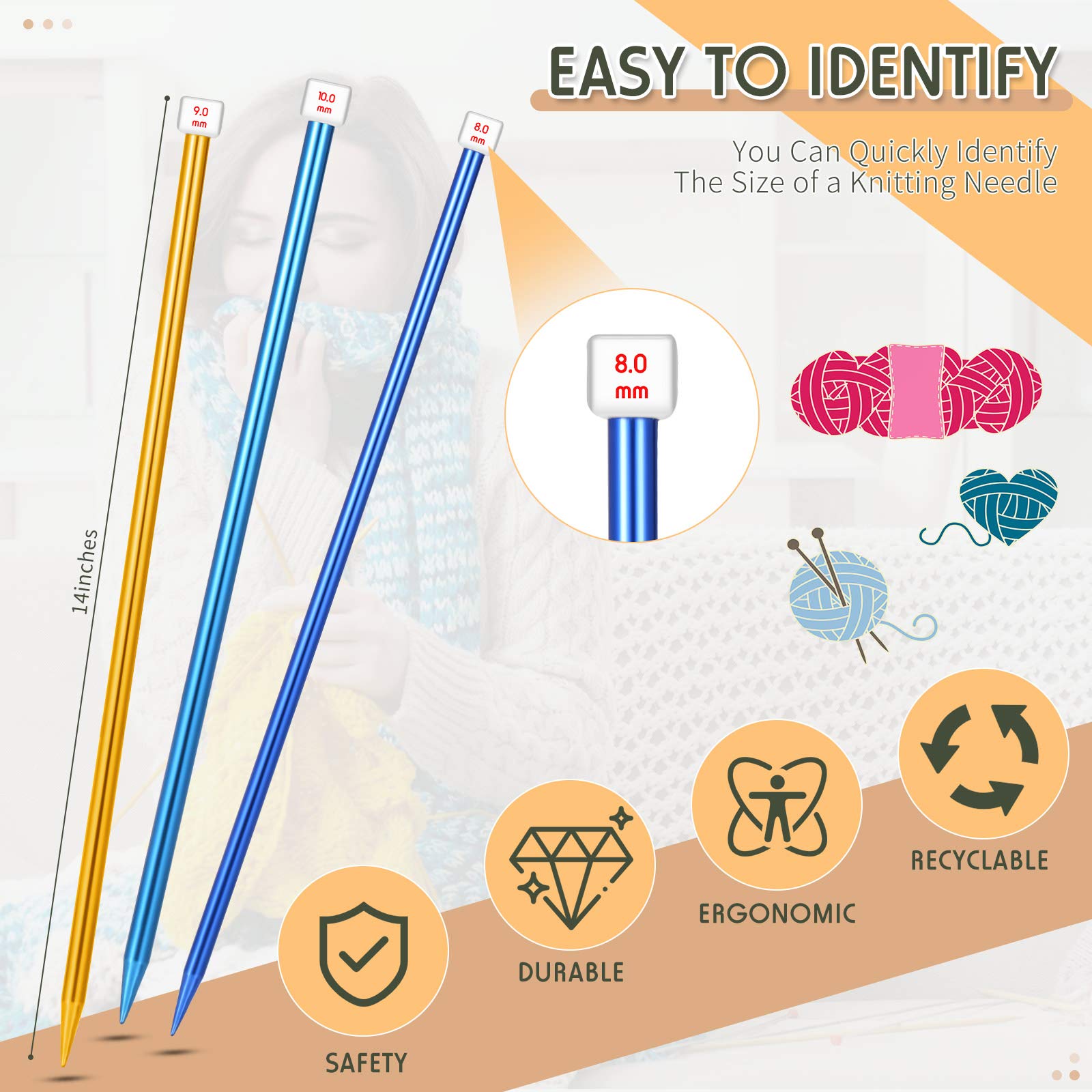6 Pieces/ 3 Pairs Aluminum Straight Knitting Needles Set, 8 mm, 9 mm and 10 mm,14 Inch Single Point Knitting Needles, Color Extra Long Sweater Straight for DIY Projects