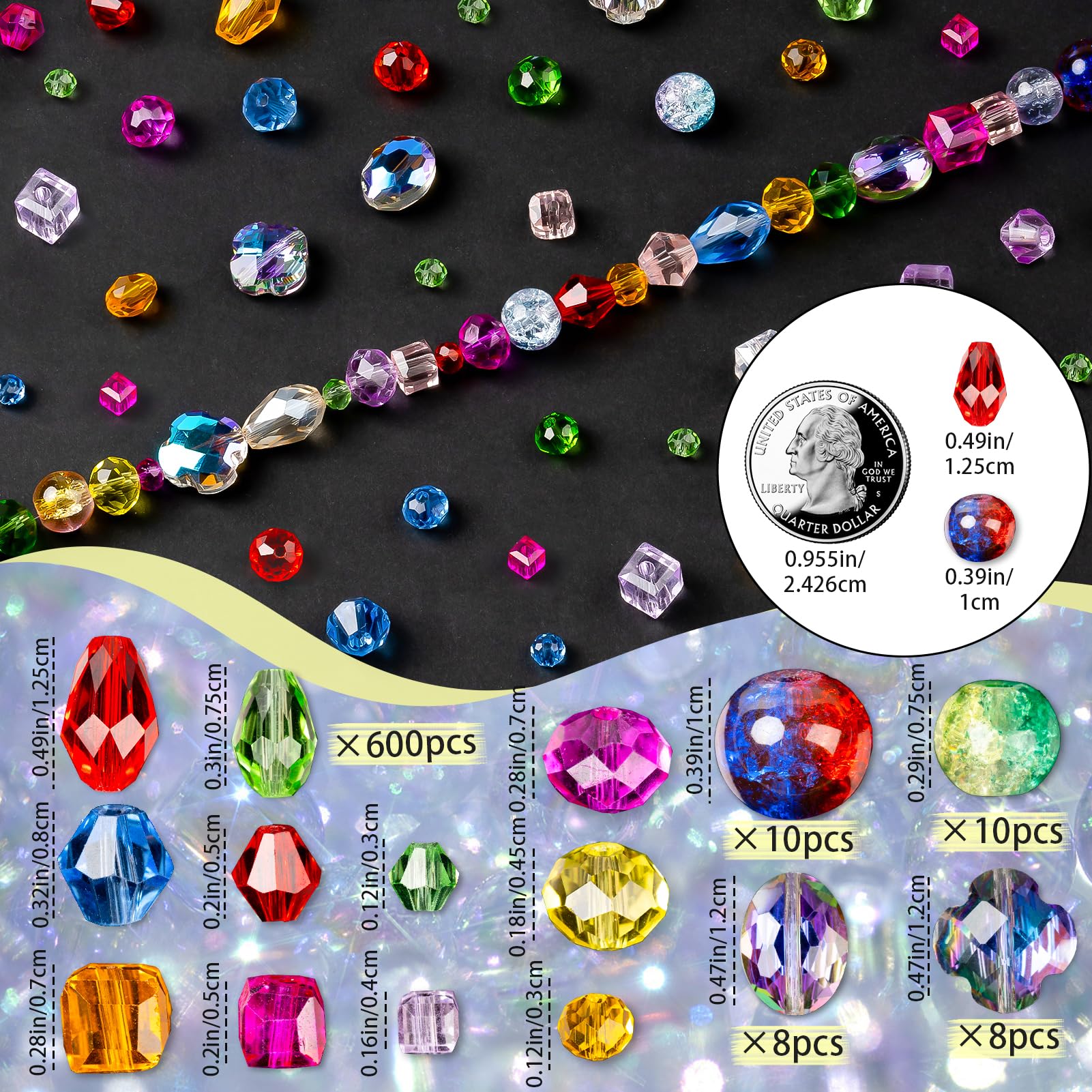 - CRYSTAL COLORED BEADS:Our 636pcs colorful rainbow craft beads set come in different shapes and multi-colors, with crackle, lampwork, faceted, and bicone designs in a rainbow of colors, enough for you to create beautiful and unique jewelry-making pieces that reflect your personal style. Note: ropes are not included.