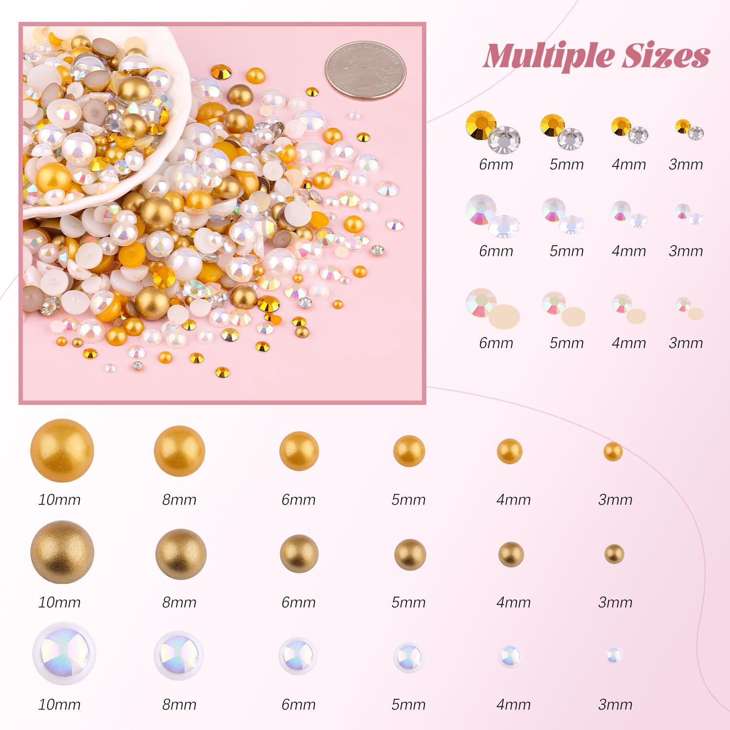 - ✦MIXED SIZE: This set contains six sizes of half pearls (3/4/5/6/8/10mm) and four sizes of round rhinestones (3/4/5/6mm), and each gem comes in 3 different colors. The various size range of pearls and gems can be used for nail art, craft, and decoration.