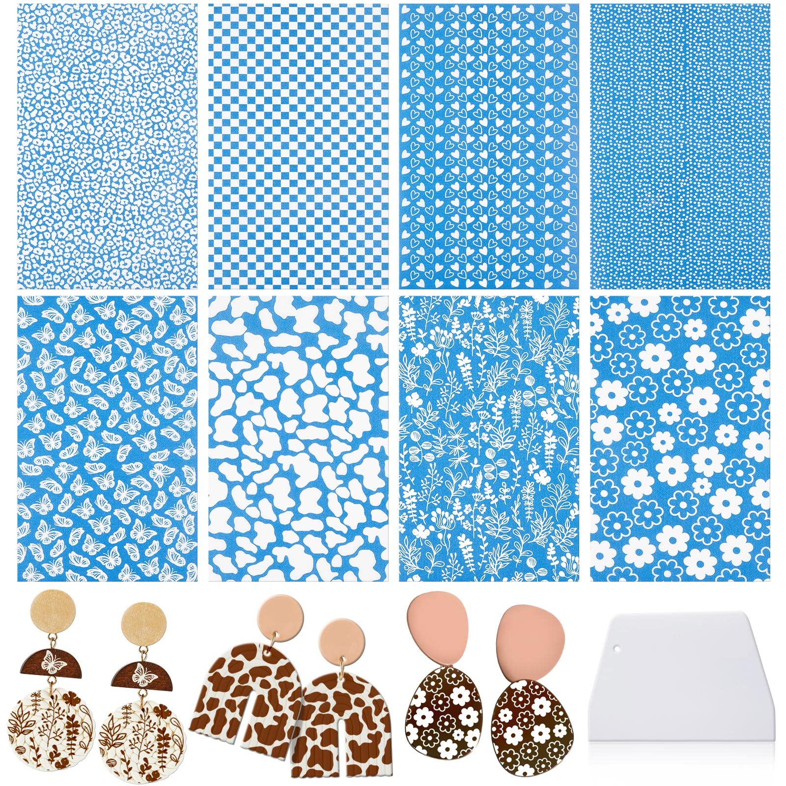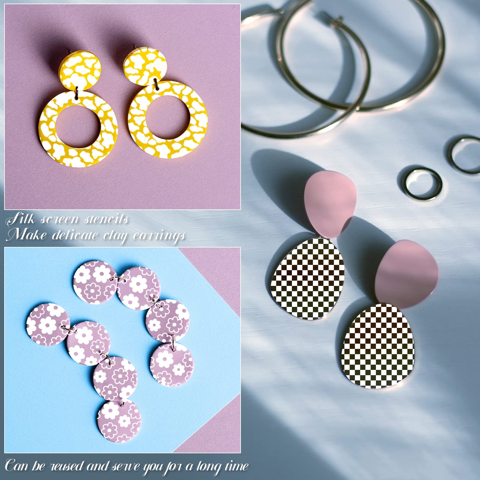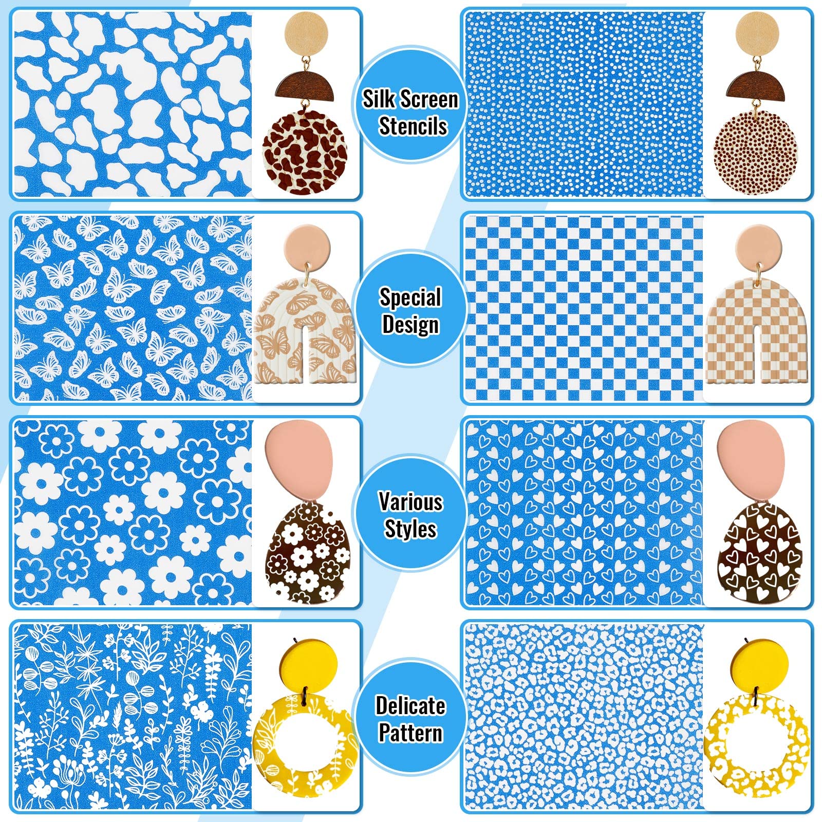9 Pcs Silk Screen Stencil for Polymer Clay Texture Sheet Cutter Tool Reusable Silkscreen Print Kit with Scraper Self Adhesive Silk Screen Printing for Jewelry Earring Making DIY Craft Supply (Flower)