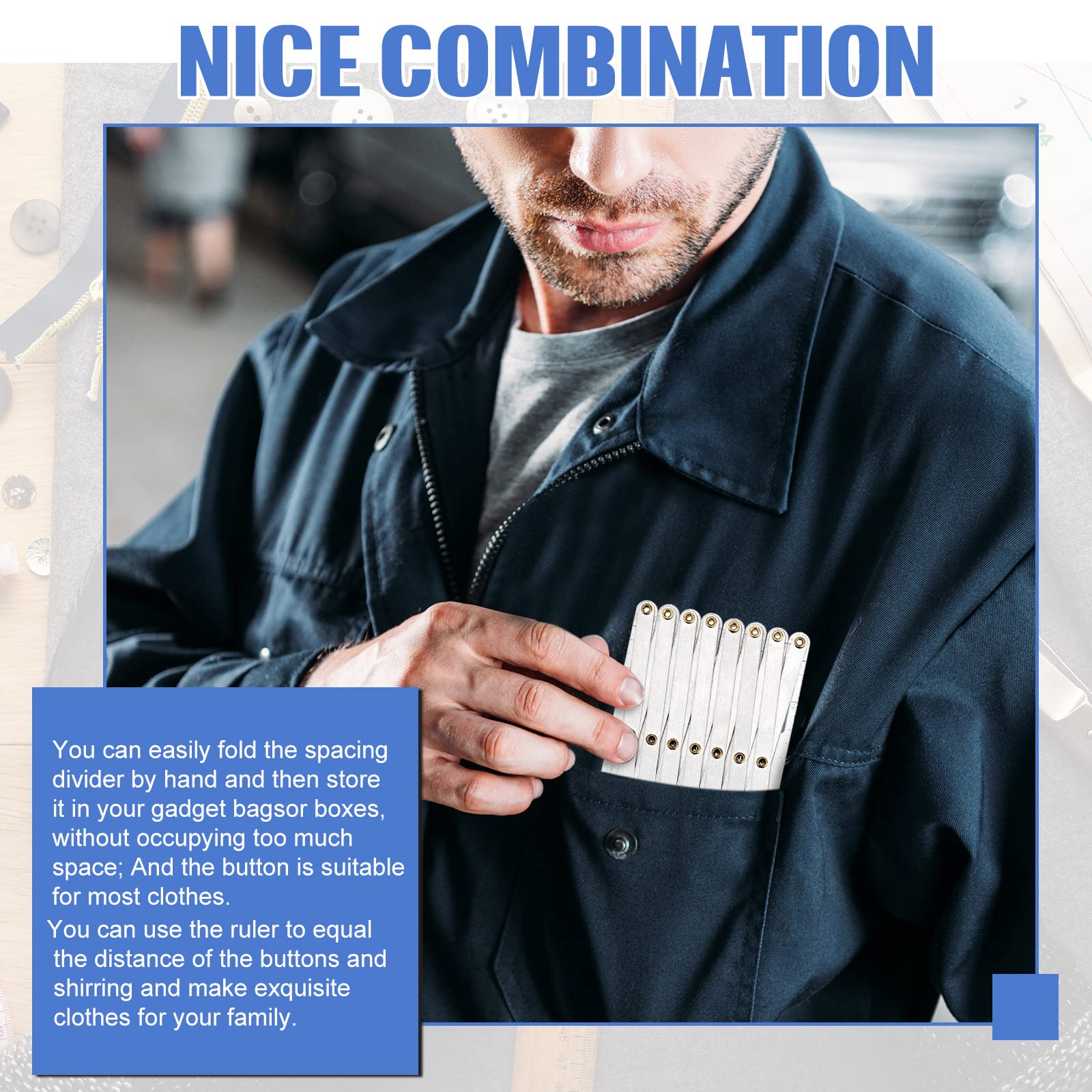 - Portable size: the measuring divider measures approx. 6.3 x 3 inch, and can be expanded up to 24 inch long, can easily fold the spacing divider by hand and then store it in your gadget bags or boxes, without occupying too much space; And each button measure approx. 1 inch in diameter with 4 holes in the center, suitable for most clothes
