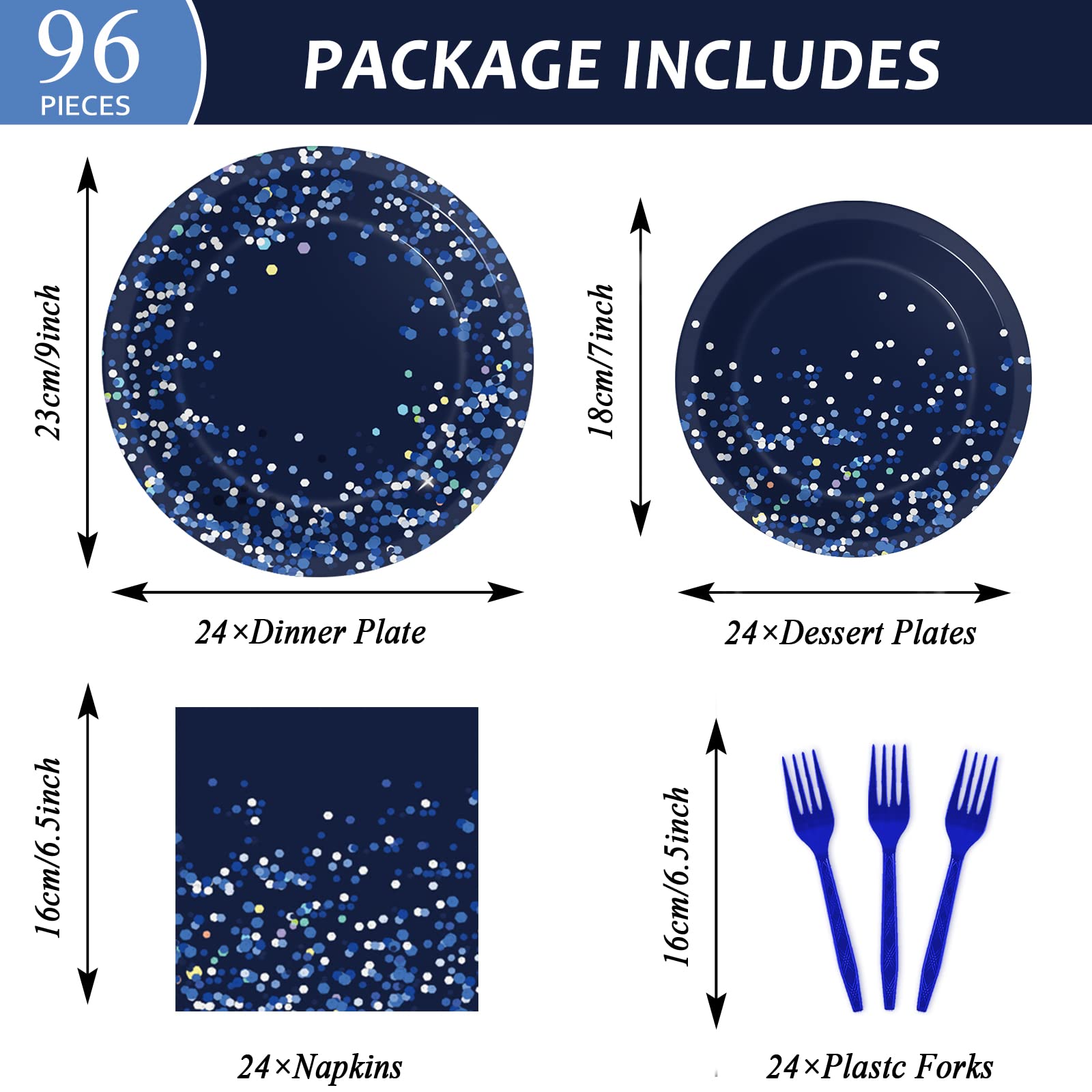 96 Pcs Blue and Silver Party Supplies Dot Confetti Paper Plates Sparkly Glitter Theme Party Decoration Confetti Party Tableware Set Bridal Shower Birthday Party Paper Plate Napkin Fork 24 Guests