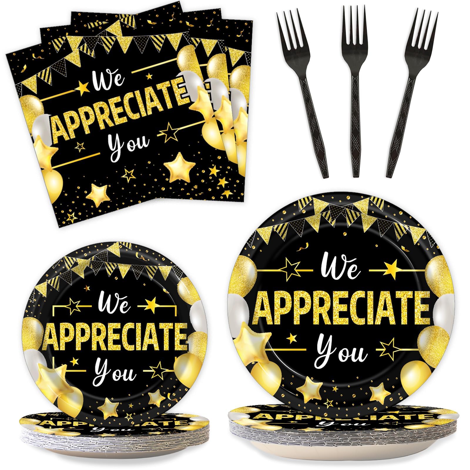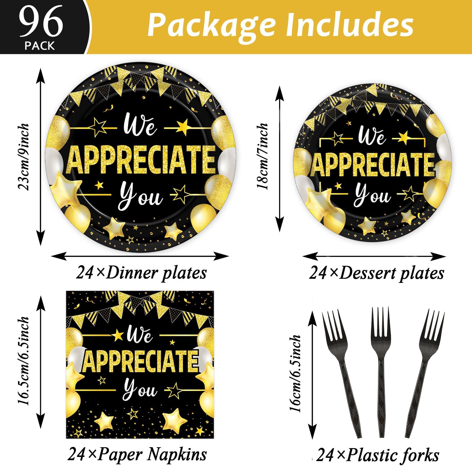 - Package Includes: You will get 24 pcs 9inch we appreciate you paper plates, 24 pcs 7inch dessert plates, 24 pcs 6.5inch appreciation party napkins and 24 pcs black forks, enough to serve 24 guests.