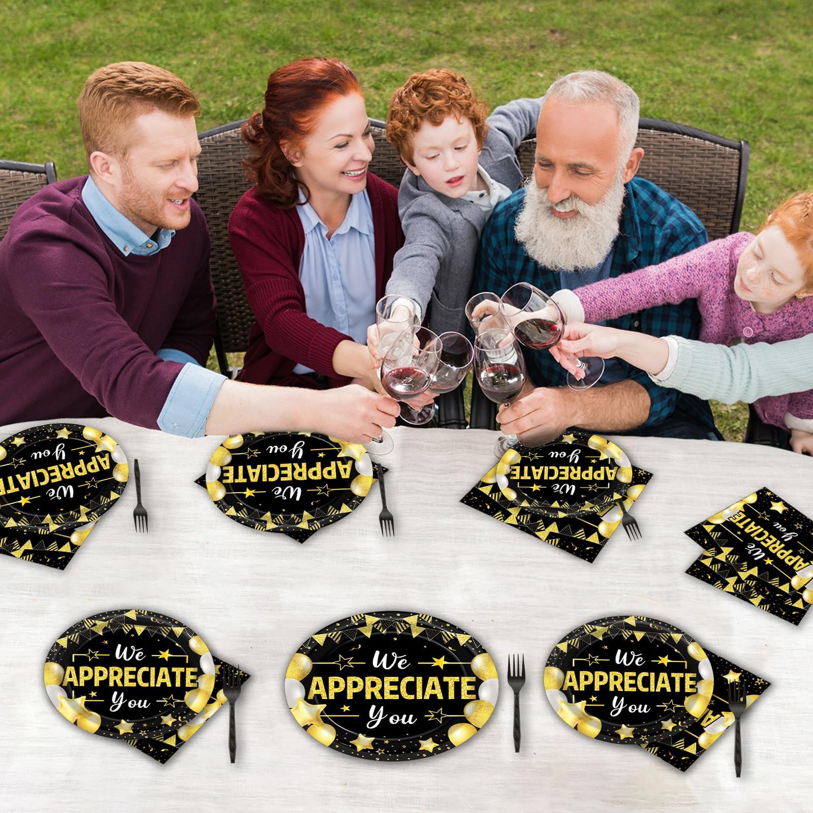96Pcs We Appreciate You Party Plates and Napkins for Employee Staff Appreciation Black Gold Party Supplies Work Anniversary Themed Plate Thank You Tableware Set for Teacher 24 Guests Party Decorations