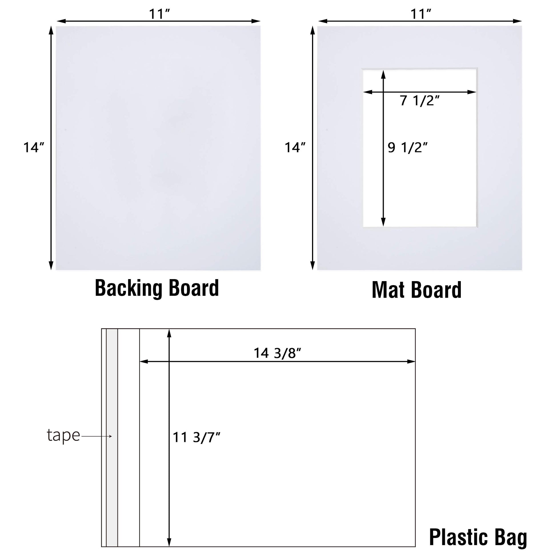 - Complete Show Kit: 25pcs 4-ply 11''x14'' white picture frame matting & 25pcs 4-ply 11''x14'' white backer board and 25pcs 11-3/7''x14-3/8'' re-sealable adhesive plastic bag.