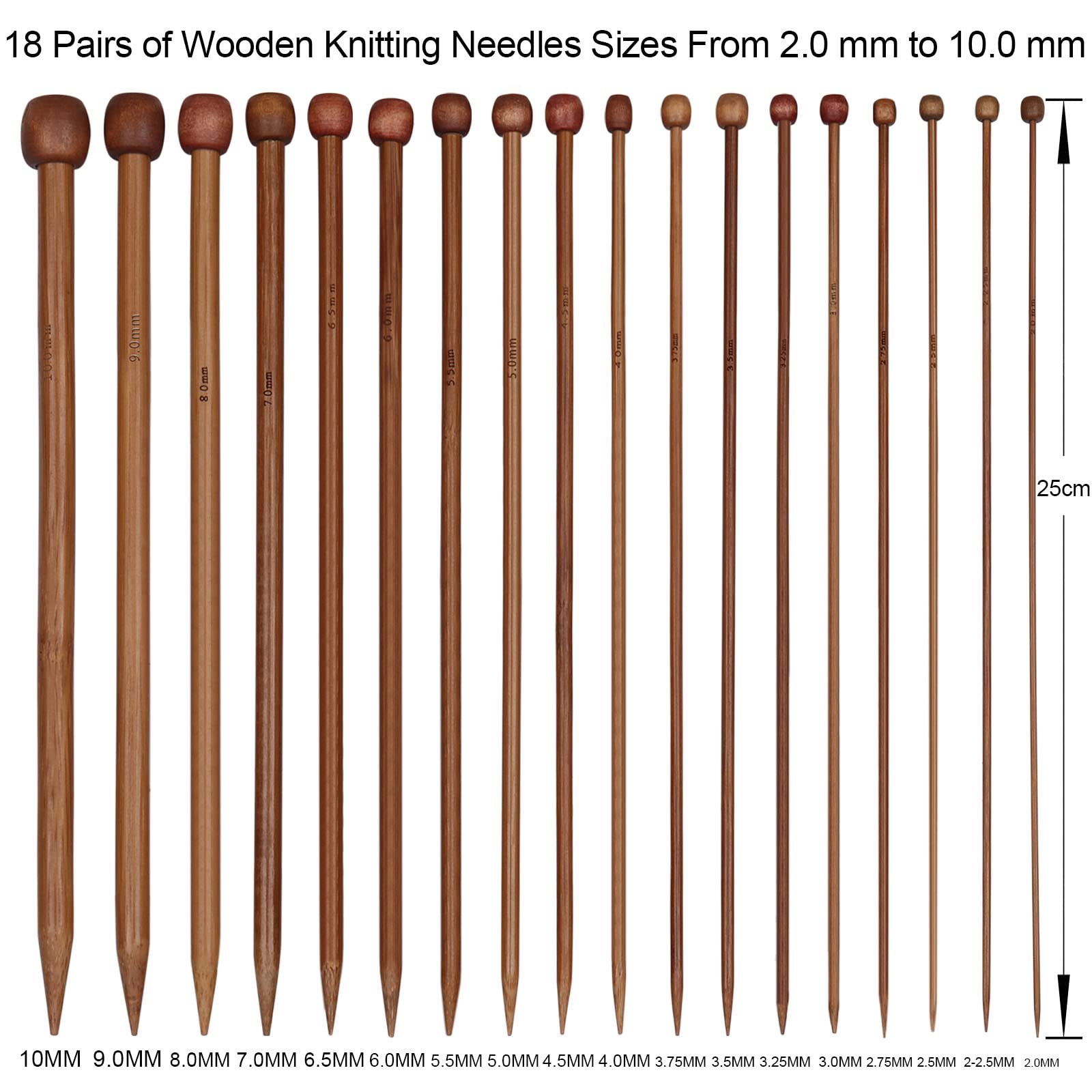 - [Short Knitting Needles Set - 18 Different Sizes] This knitting needle set includes 18 pairs of needles of different thickness, sizes: 2.0 mm, 2.25 mm, 2.5 mm, 2.75 mm, 3.0 mm, 3.25 mm, 3.5 mm, 3.75 mm, 4.0 mm, 4.5 mm, 5.0 mm, 5.5 mm, 6.0 mm, 6.5 mm, 7.0 mm, 8.0 mm, 9.0 mm, 10.0 mm. The length is about 10 in/25 cm. As a novice or beginner, if you don't want to spend a fortune on needles but want to try a range of sizes, this set of bamboo knitting needles is your ideal choice.