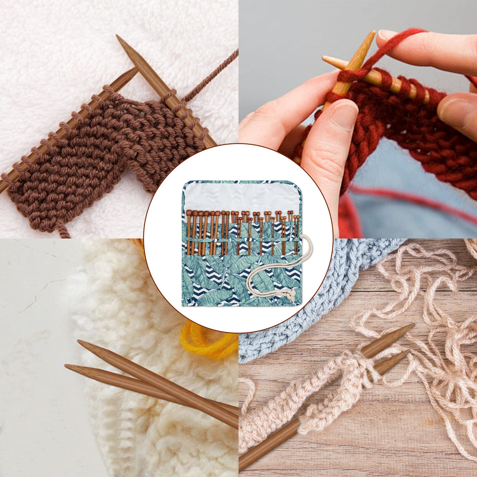 - [Knitting Needles Sets with Case] This knitting needle storage bag is made of soft premium fabric and is very durable. Flip cover design, green leaves print pattern looks very pretty, and there are two twisted ropes that can be knotted at will to prevent needles from falling out. The knitting needles roll bag size is 38 x 38 cm with 20 slots, give plenty of space for your needles and keep everything neat and tidy.