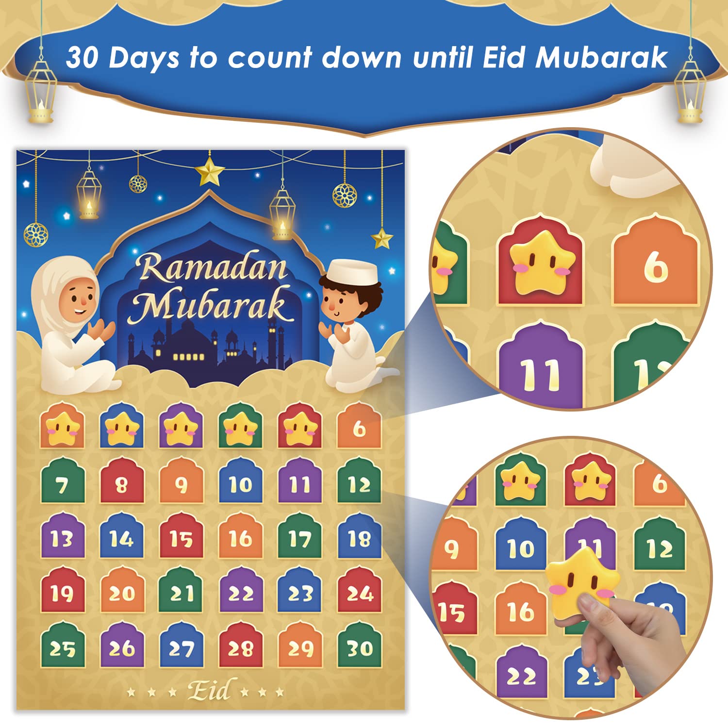 - Best Design: "Ramaddan Mubarak", 1-30 numbers, moon, stars, mosque, lamp, Muslim, pot, candle, etc. With complete elements, Ramadan advent calendar is a high-quality Eid decoration and countdown calendar. The design of putting star stickers on the calendar can make children spend unforgettable and interesting Eid.