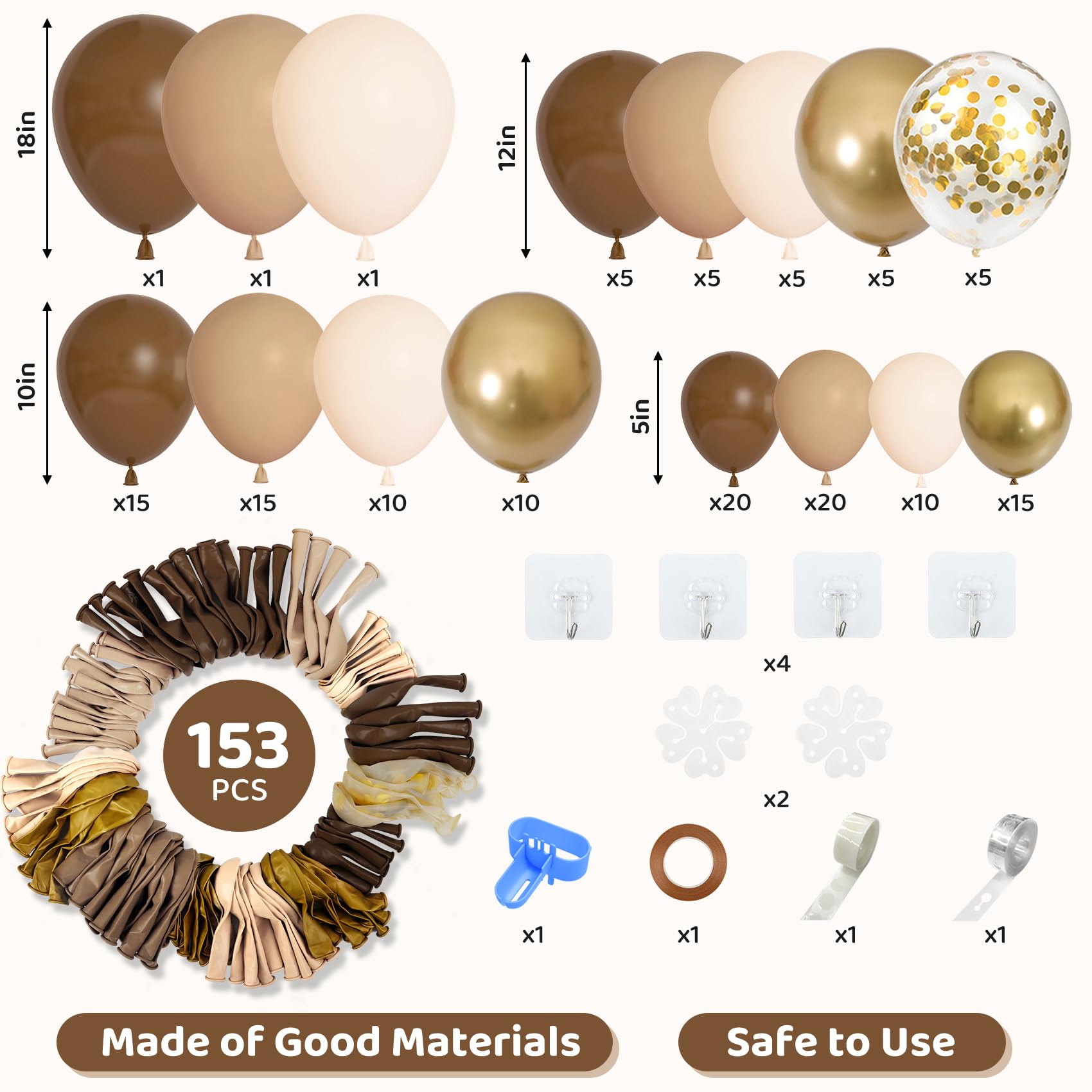 Amandir 153pcs Brown Balloon Garland Arch Kit, Different Sizes 18 12 10 5 inch Brown Nude Latex Metallic Confetti Gold Balloons for Neutral Bear Baby Shower Safari Birthday Party Decorations Supplies