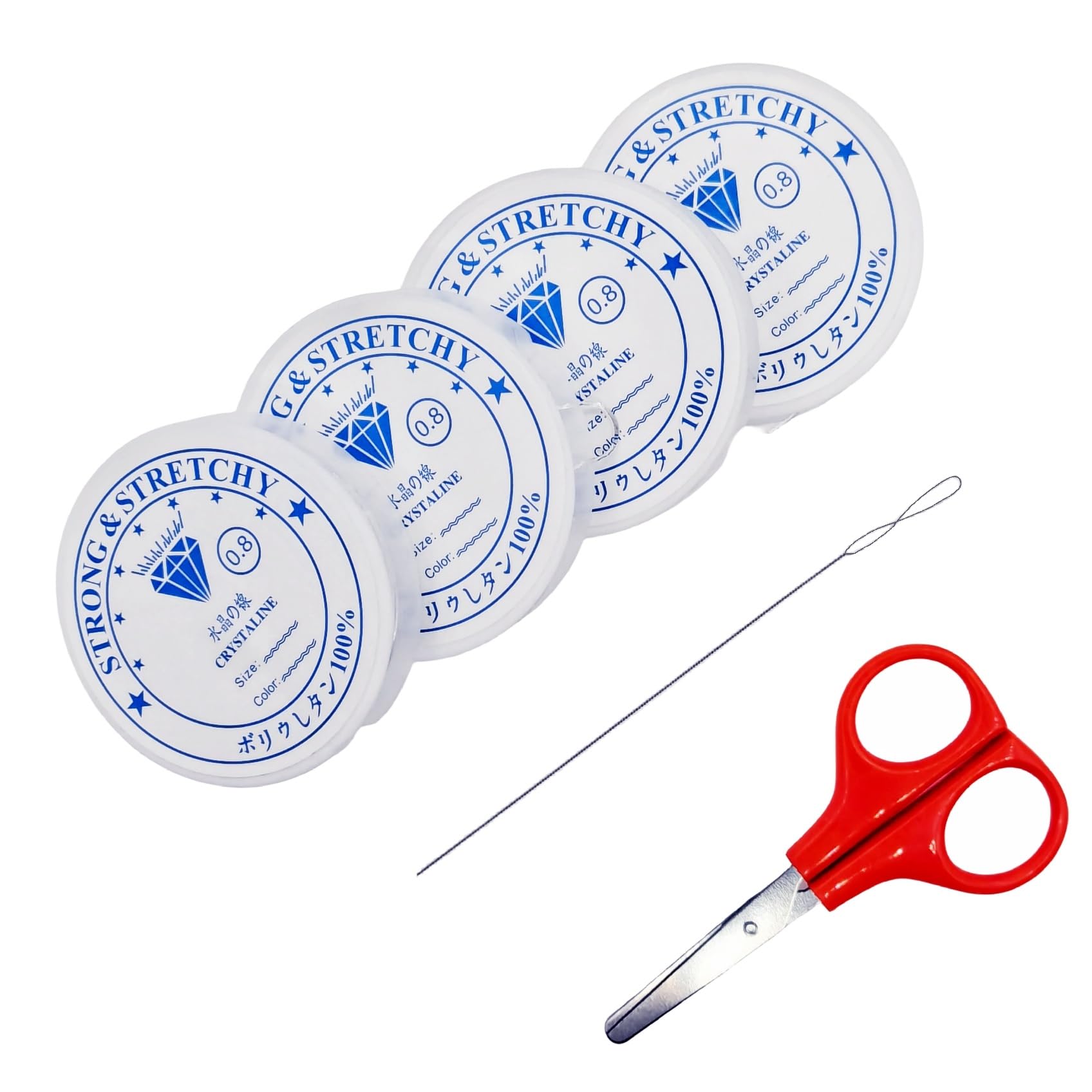 Amaney 4 Roll 0.8mm Elastic String, Stretchy String Crystal String Bead Cord with Beading Needles and Scissors for Bracelet, Beading and Jewelry Making