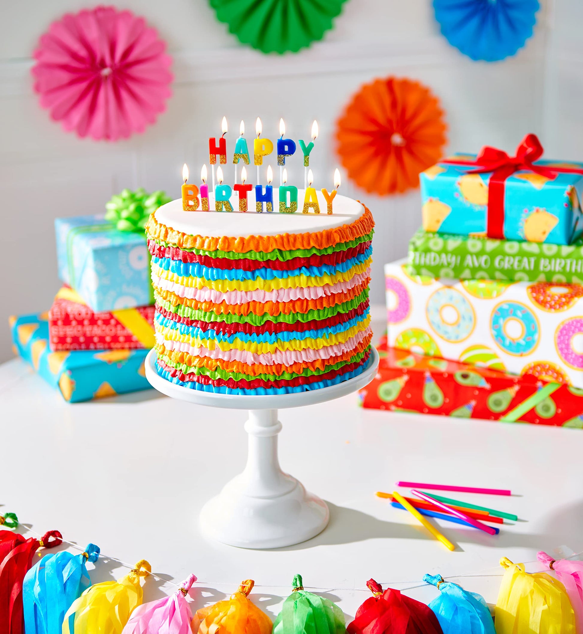 Details: Spell out “happy birthday” with this fun set of candles from American Greetings. This pack features 13 toothpick candles in assorted colors and gold glitter spelling “HAPPY BIRTHDAY,” and 12 tall candles in assorted colors. Perfect for kids or adults, these fun candles make any birthday feel a little extra special.