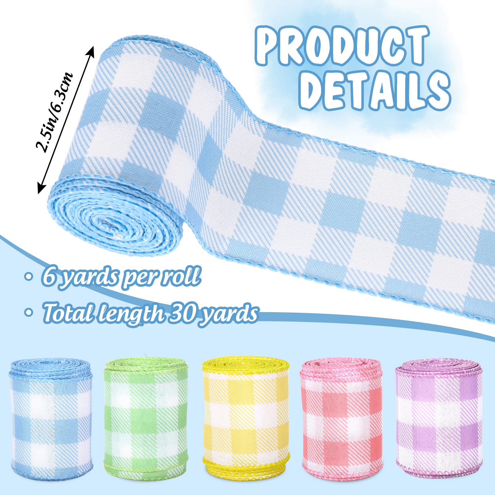 Spring Wired Edge Ribbon 30 Yards Pastel Buffalo Plaids Craft Ribbon Light Blue Yellow Pink Purple Green Decorative Fabric Ribbon for Easter Wreath Bow Making DIY Crafts Wrapping, 5 Roll