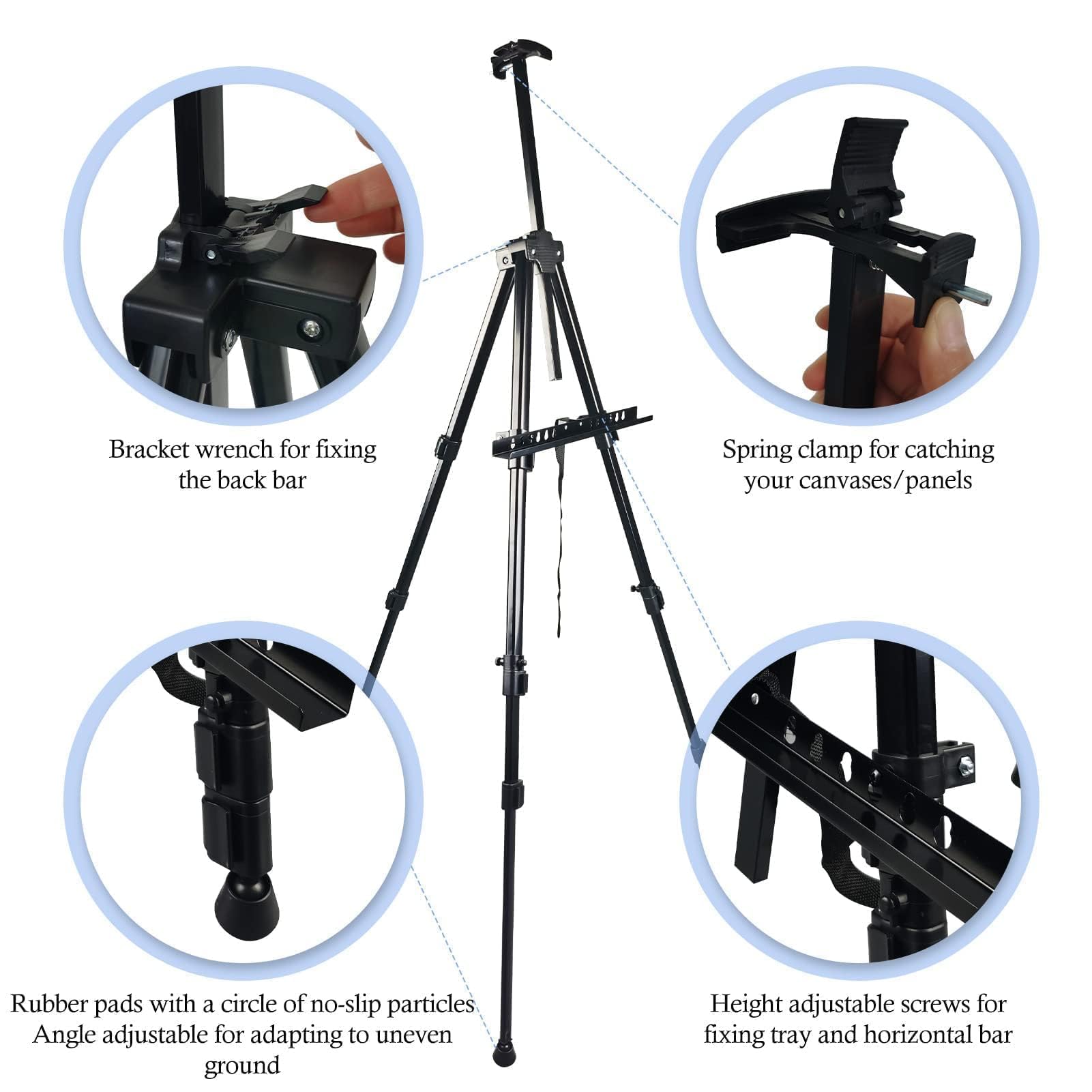 - - Adjustable Height and Angle: This art easel stand for painting canvases can be adjusted from 17 to 66 inches in height and can be folded down to only 21 inches for easy storage and transportation. With easy-to-use knobs, you can quickly adjust the height and angle that's just right for you