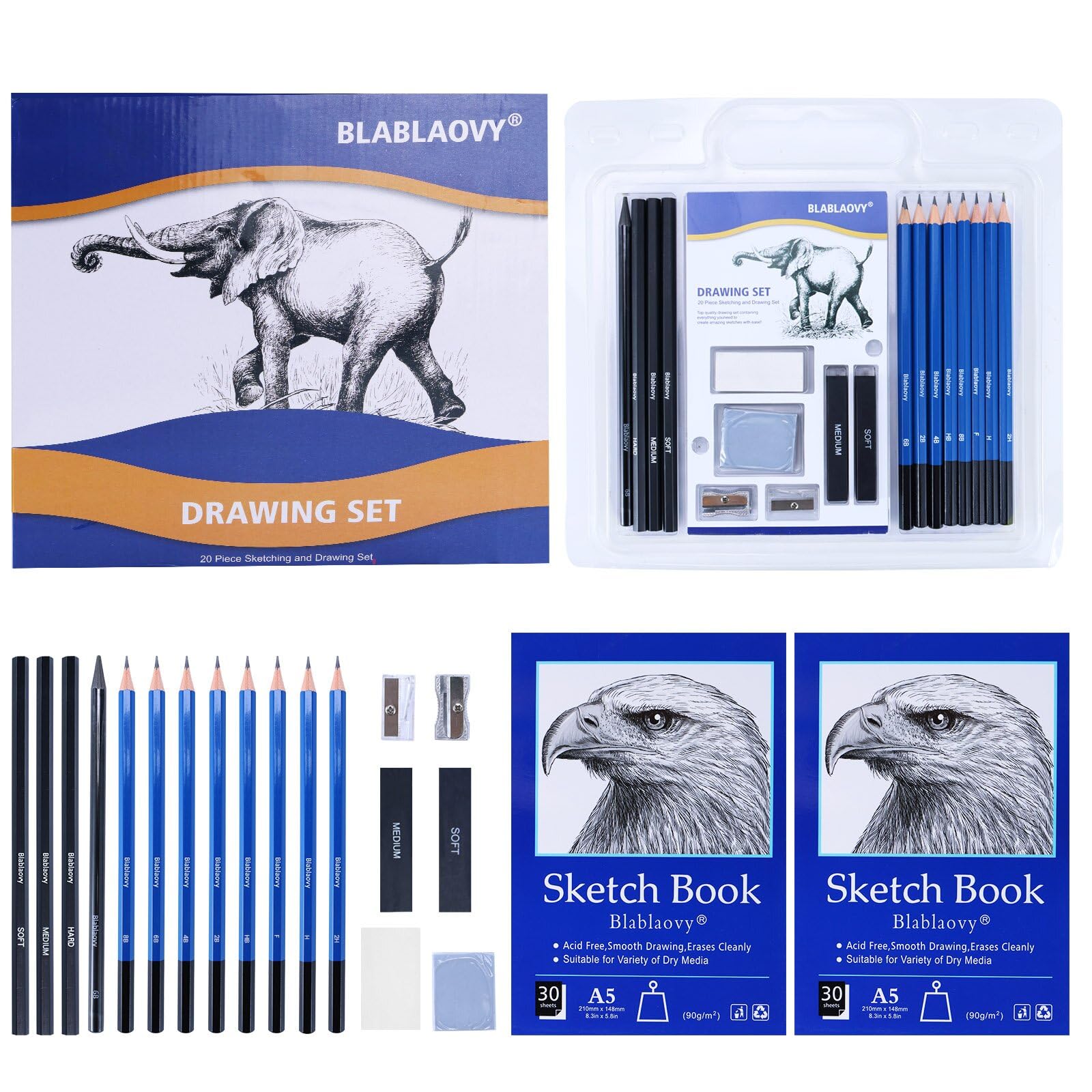 - Pro Drawing Set with 2 Sketchbook : The Classic Sketchbook is ideal for pencil, charcoal, graphite drawing and quick sketching. It features 30 sheets/ 60 pages of premium quality 90 gsm acid-free drawing paper with a smooth texture, perfect for sketching with graphite, charcoals, pastels and other dry media. The hardcover sketchbook measures 8.3x 5.8 inches for versatile use