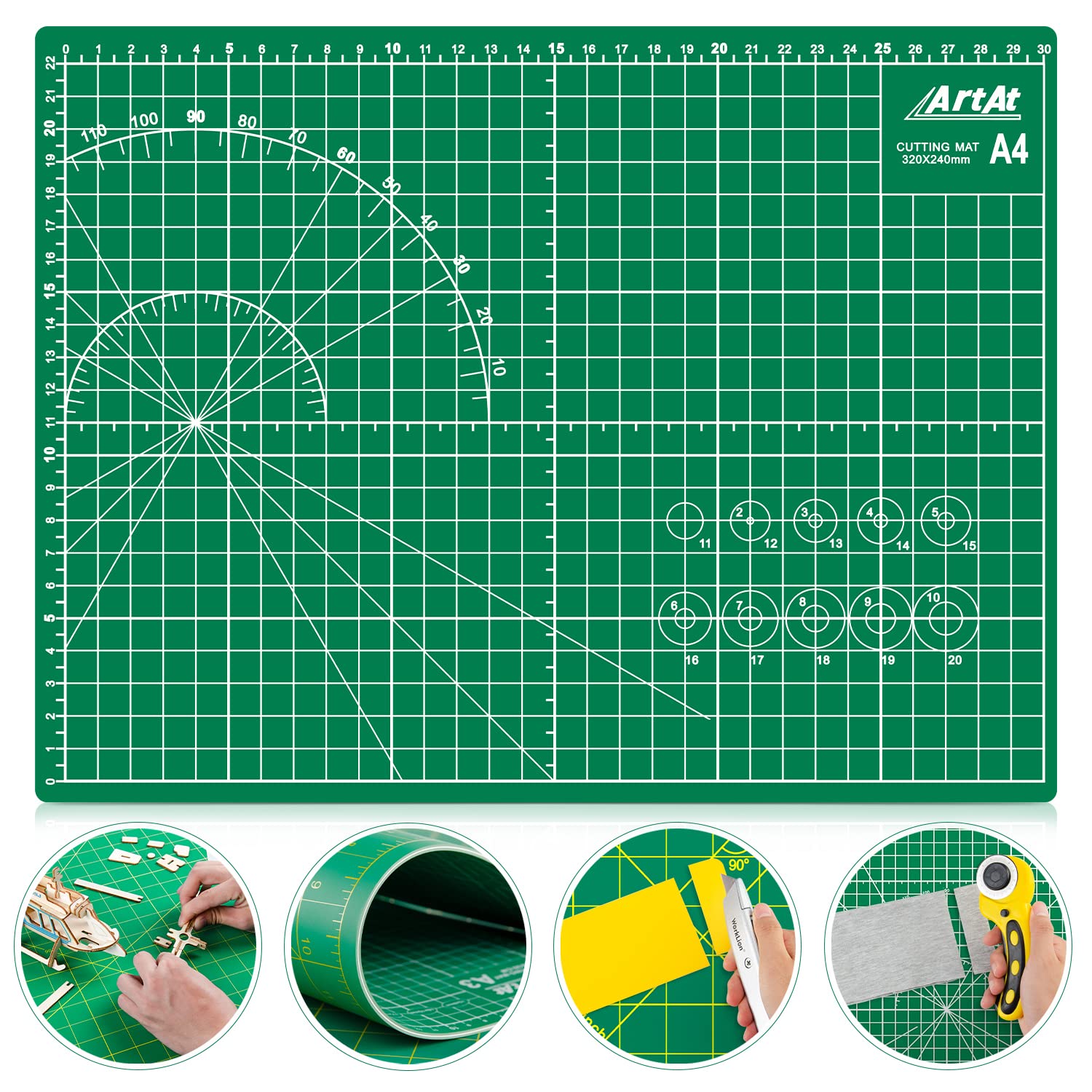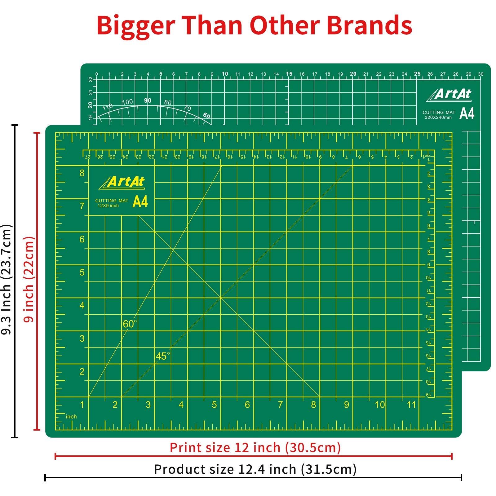 Details: ArtAt's cutting mats is made of 5-ply PVC material, it's durable enough and provide 1/8'' ( 3mm ) of work surface protection.These green professional mats are reversible with grids marking, different angles and diagonals on each side.Features:Mat size: 9.5 x 12.5 inchesGrid size: 9 x 12 inchesArtAt cutting mat is with white core layer, extremely durable and difficult to cut off5 layer PVC construction for max healing and keep the blades sharpnessScreened grid is easy for precise alignment