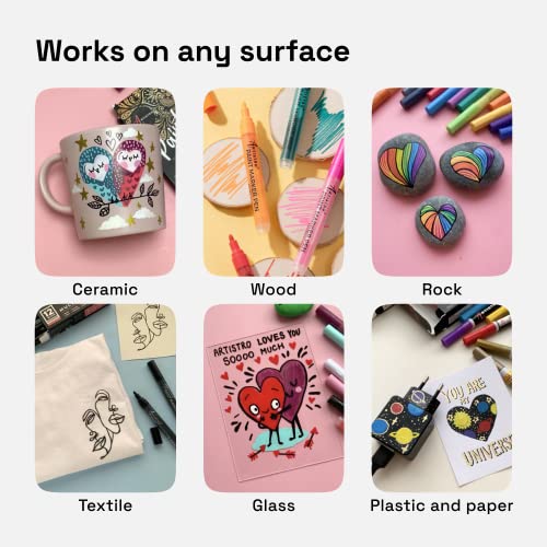 - HIGH QUALITY: Artistro acrylic paint markers have highly pigmented Italian acrylic ink that dries quickly. The acrylic markers have a very durable matte effect. The Japanese nylon nibs on these acrylic pens prevent flooding, jamming, and messes.