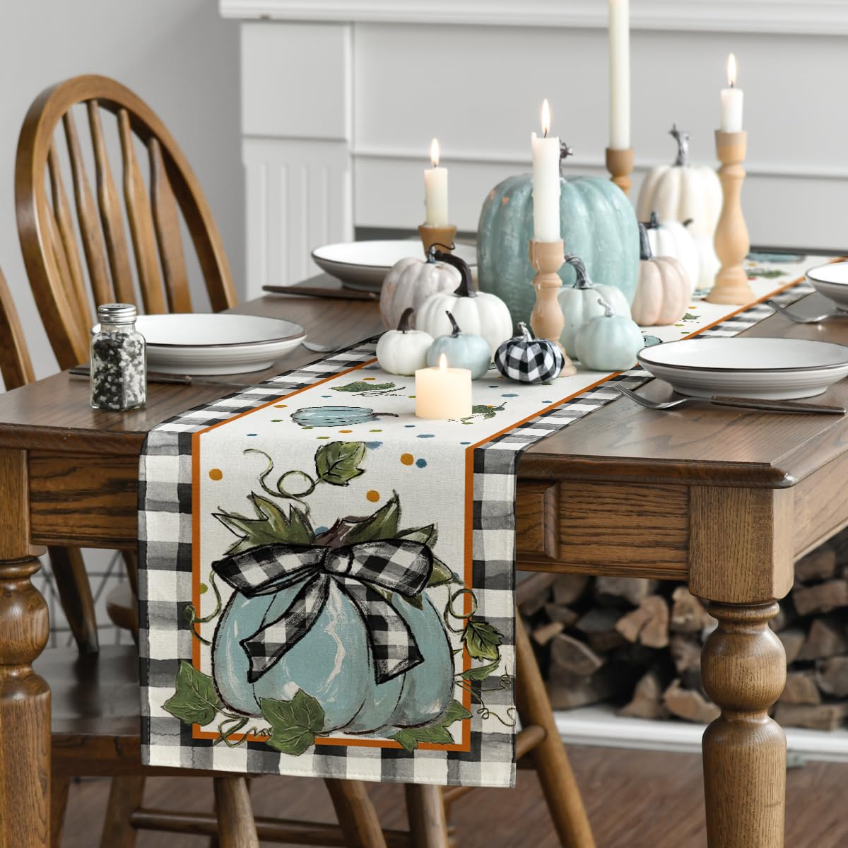 Artoid Mode Blue Pumpkin Bowknot Buffalo Plaid Fall Table Runner,Seasonal Autumn Kitchen Dining Table Decoration for Home Party Decor 13x72 Inch