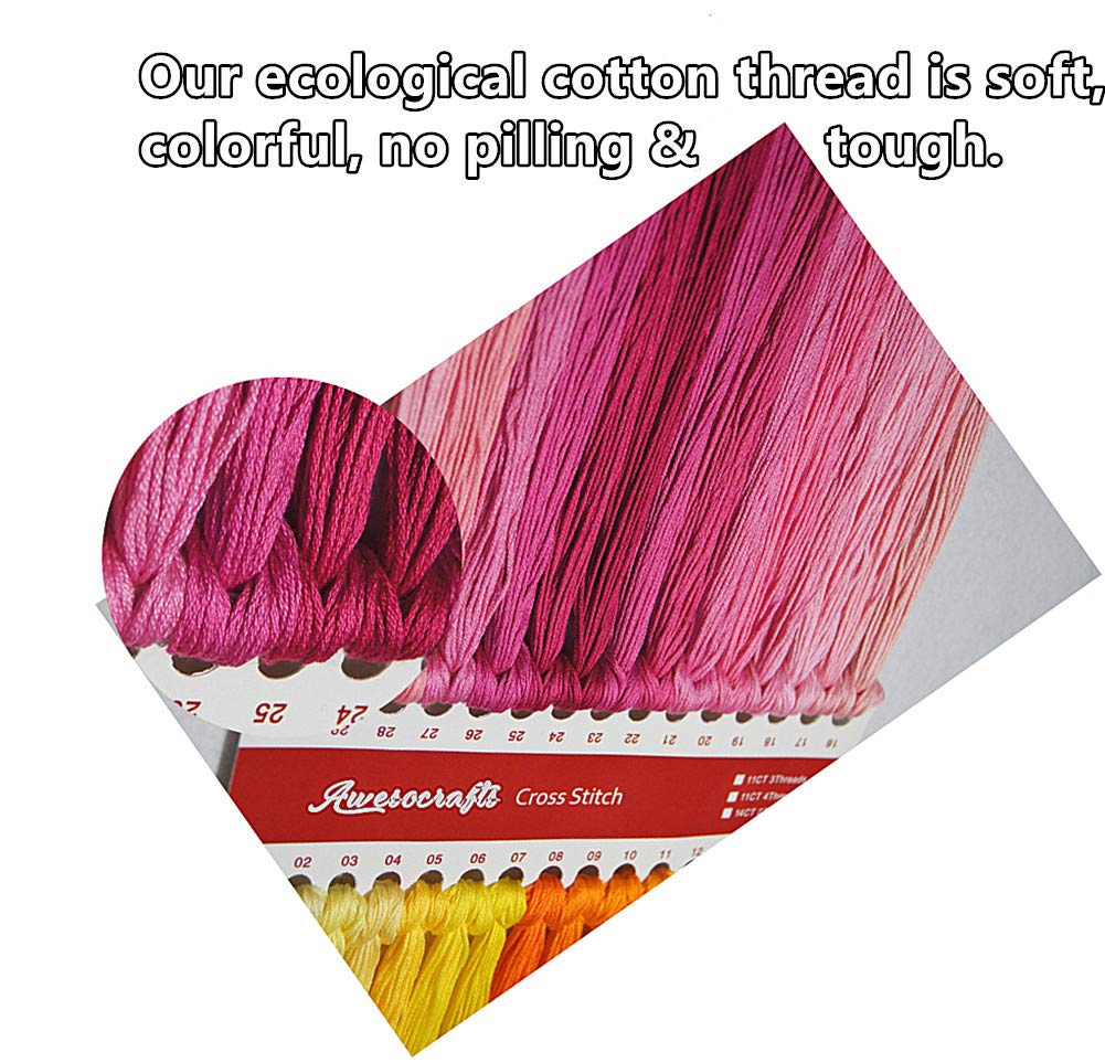 * 11CT is 11 counts per inch of fabric, which is more vision-friendly and easier to embroider. 11CT type please use 3 strands threads. Each line we provide is composed of 6 strands, so you need to divide them before you work.