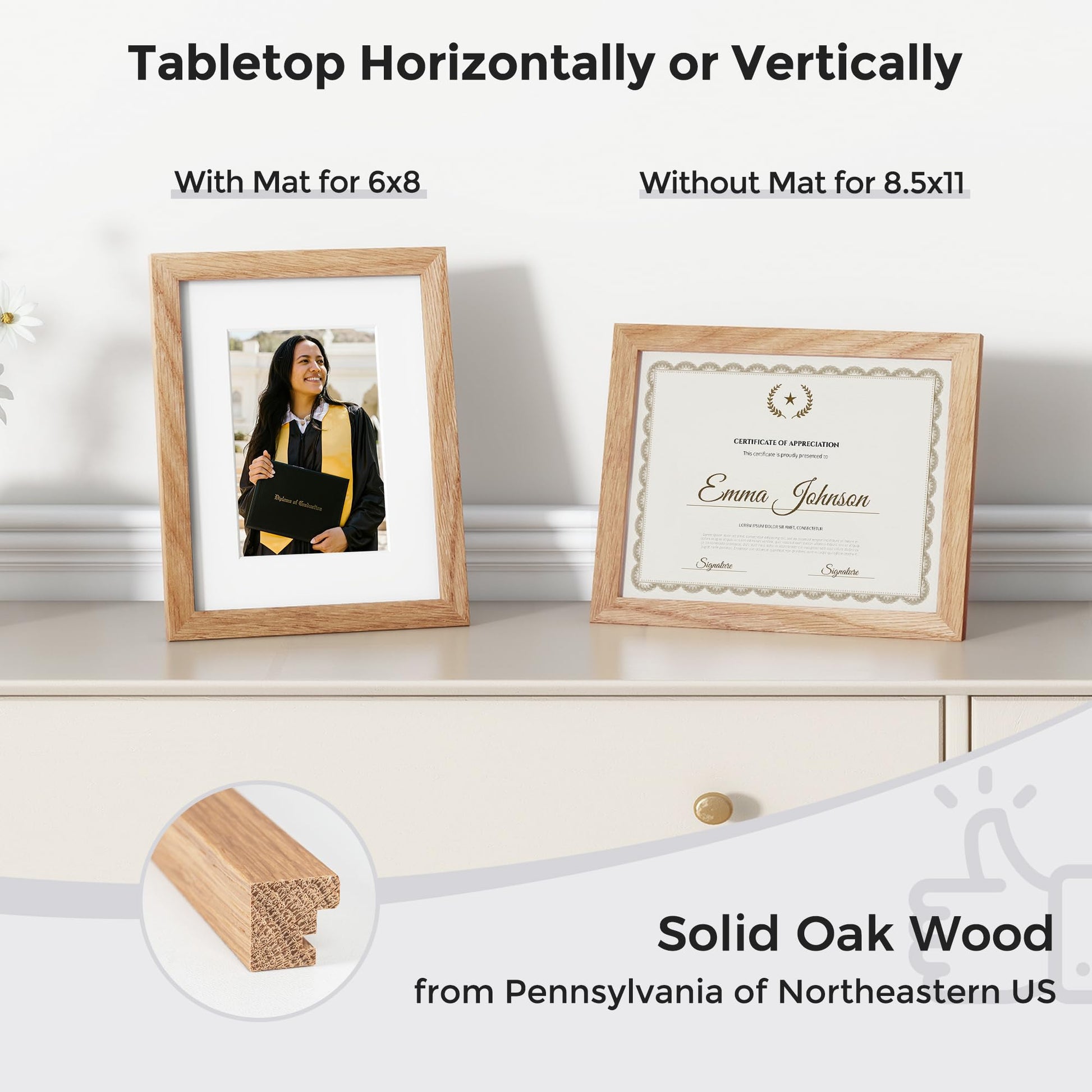 - Highest Quality OAK Materials: Our 8.5''x11'' natural wood frame made of 100% white oak wood, comes from Pennsylvania of Northeastern US, is the most widely used timber;because the excellent texture, long-lived durable characteristics, becomes the one of the most popular woods in home decor, and due to the grain pattern, suitable various kinds of decoration style