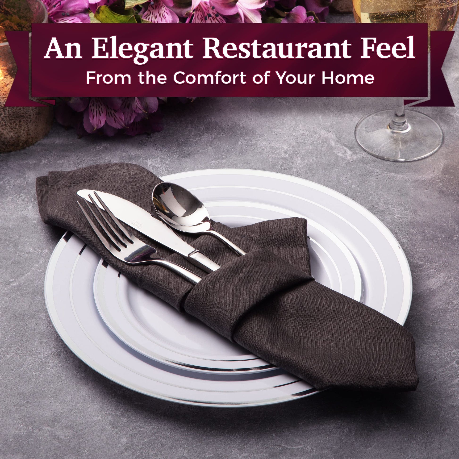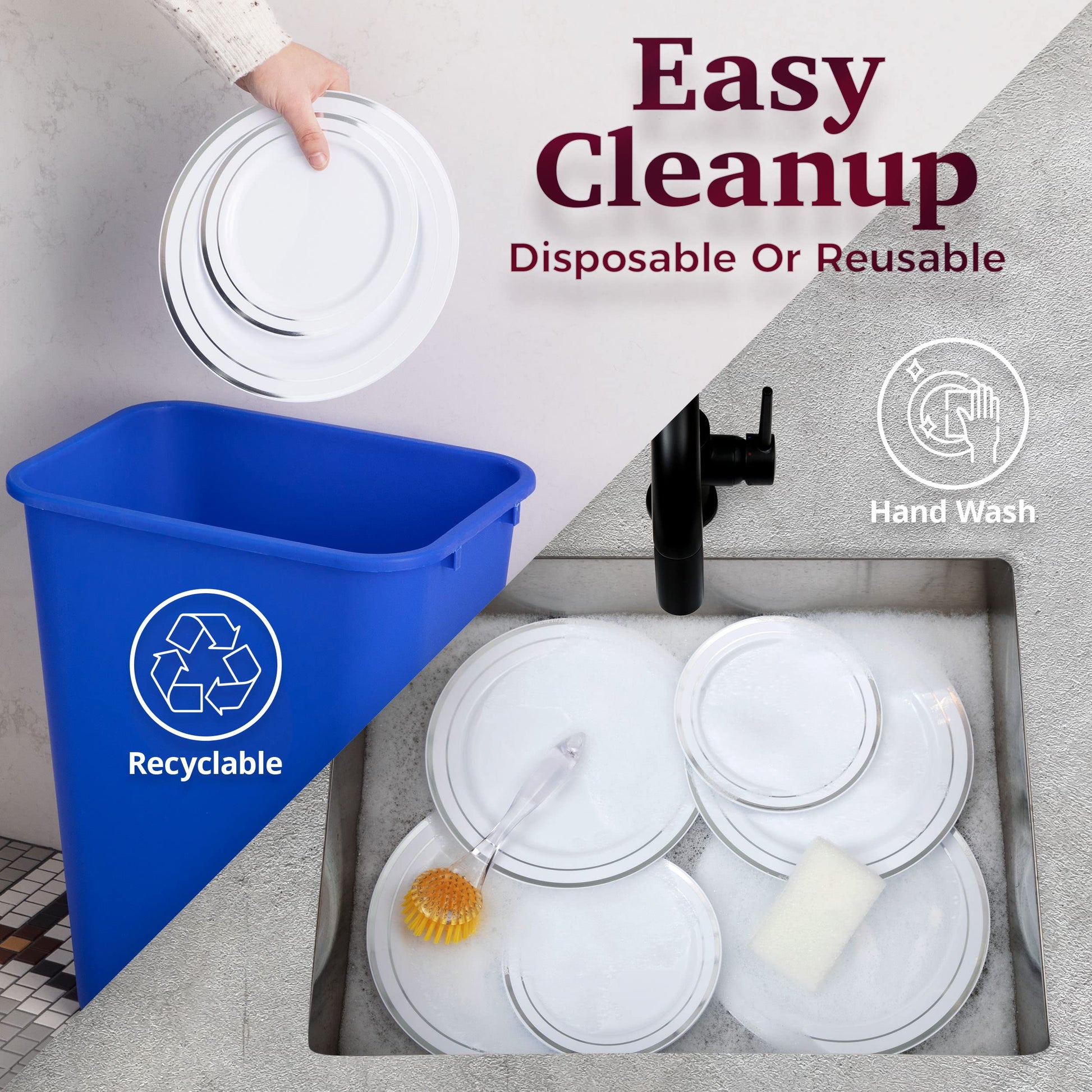 - ELEGANT & STYLISH - Perfect plates for formal events, these fancy disposable plates have a beautiful, classy design that looks like real ceramic. The high gloss premium platic plates have an elegant, classic appearance perfect for formal settings and events like wedding receptions, outdoor parties, birthdays, and more! These clean white party plates with silver trim accents match beautifully with silverware and glassware, perfect for holidays. Match with white, gold, silver or any color cutlery.