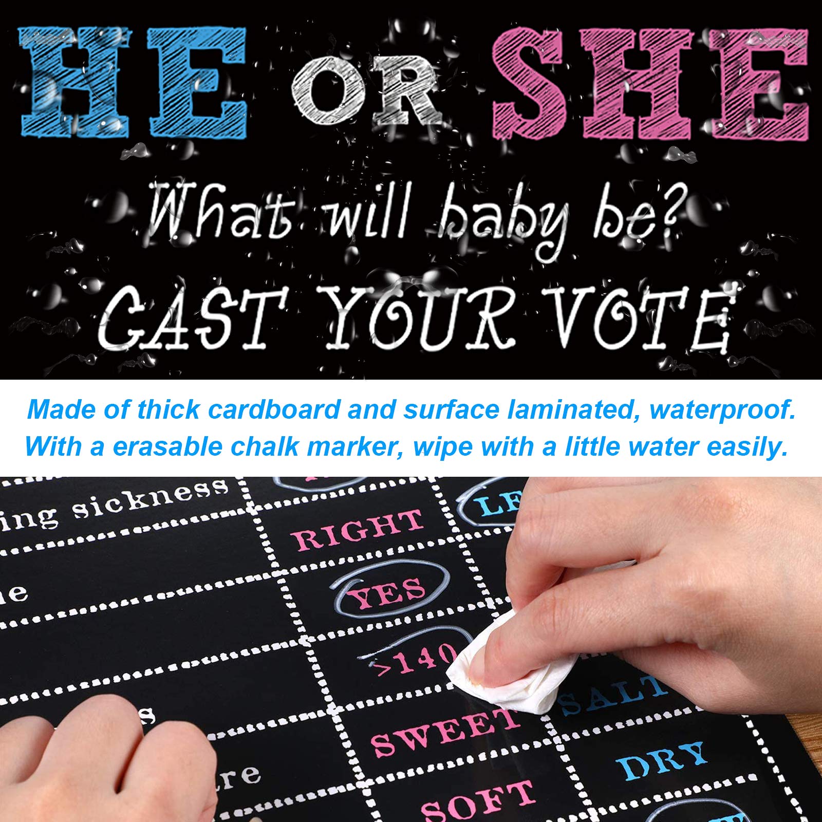 - Erasable and reusable - Gender reveal party supplies cards are made of thick paperboard which is surface laminated, sturdy material and durable. We use premium inks and sublimation printing, so the pattern looks clear, colors are vibrant. It comes with a erasable white chalk marker, the mark can wipe with wet wipes easily.