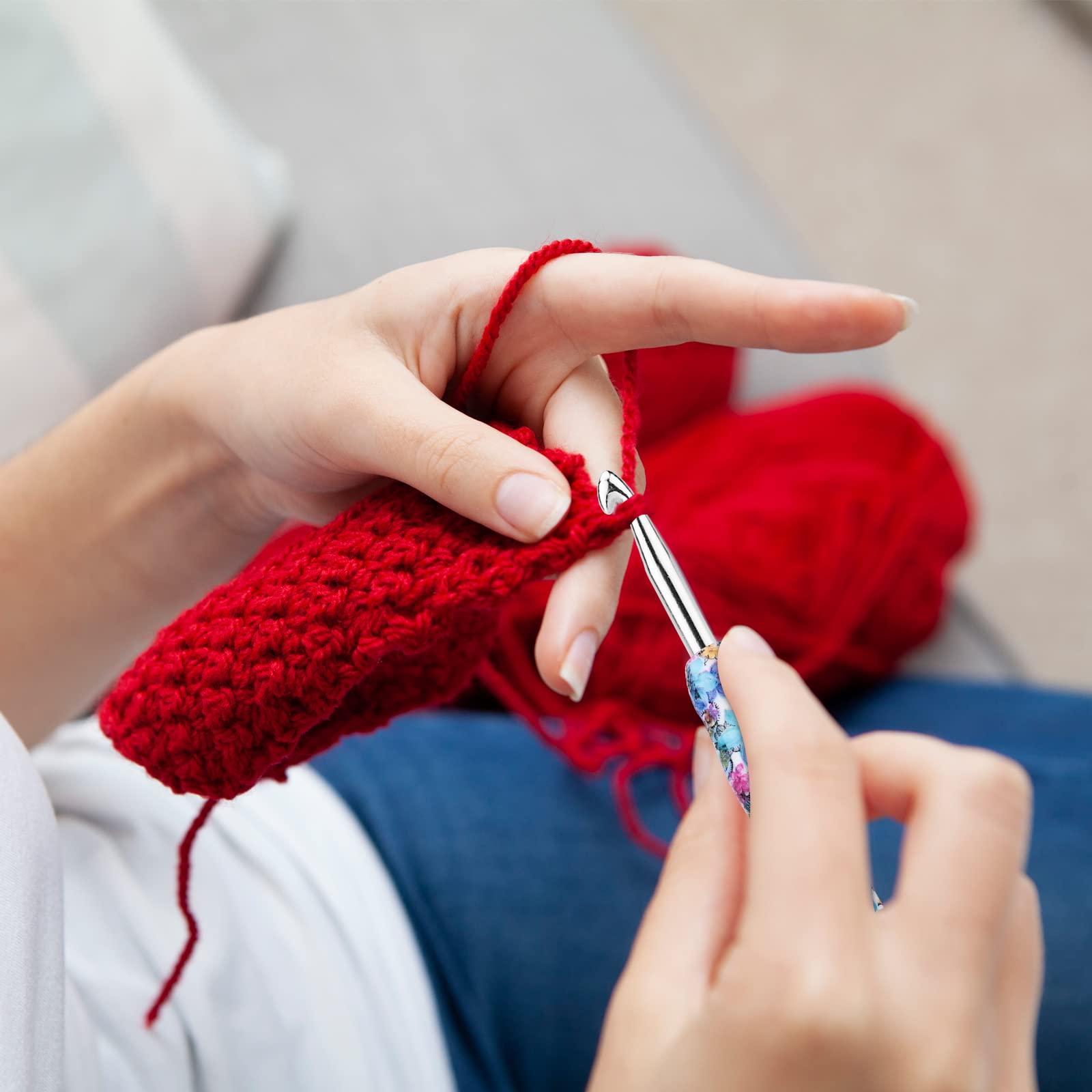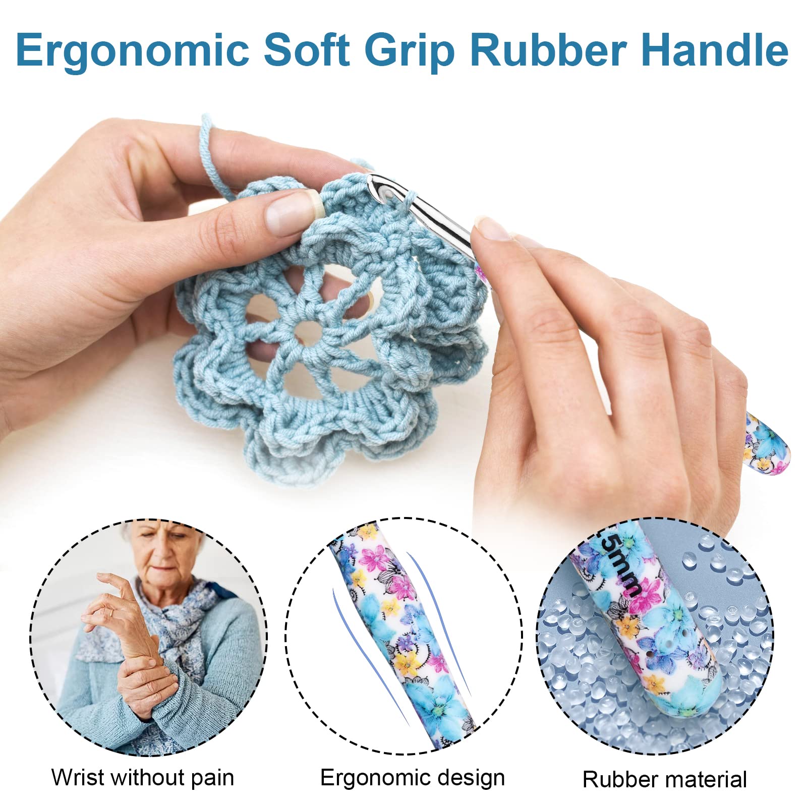 - 【Crochet Hooks with Rubber Handles】Knitting needles with soft grip handles, curved design makes the crochet hook fit the joints of the hand more without putting pressure on the fingers and wrist. It is perfect for Arthritic Hands. Comfortable rubber handle provide a nice firm grip, you can crochet longer without discomfort. Best gift for families and friends.