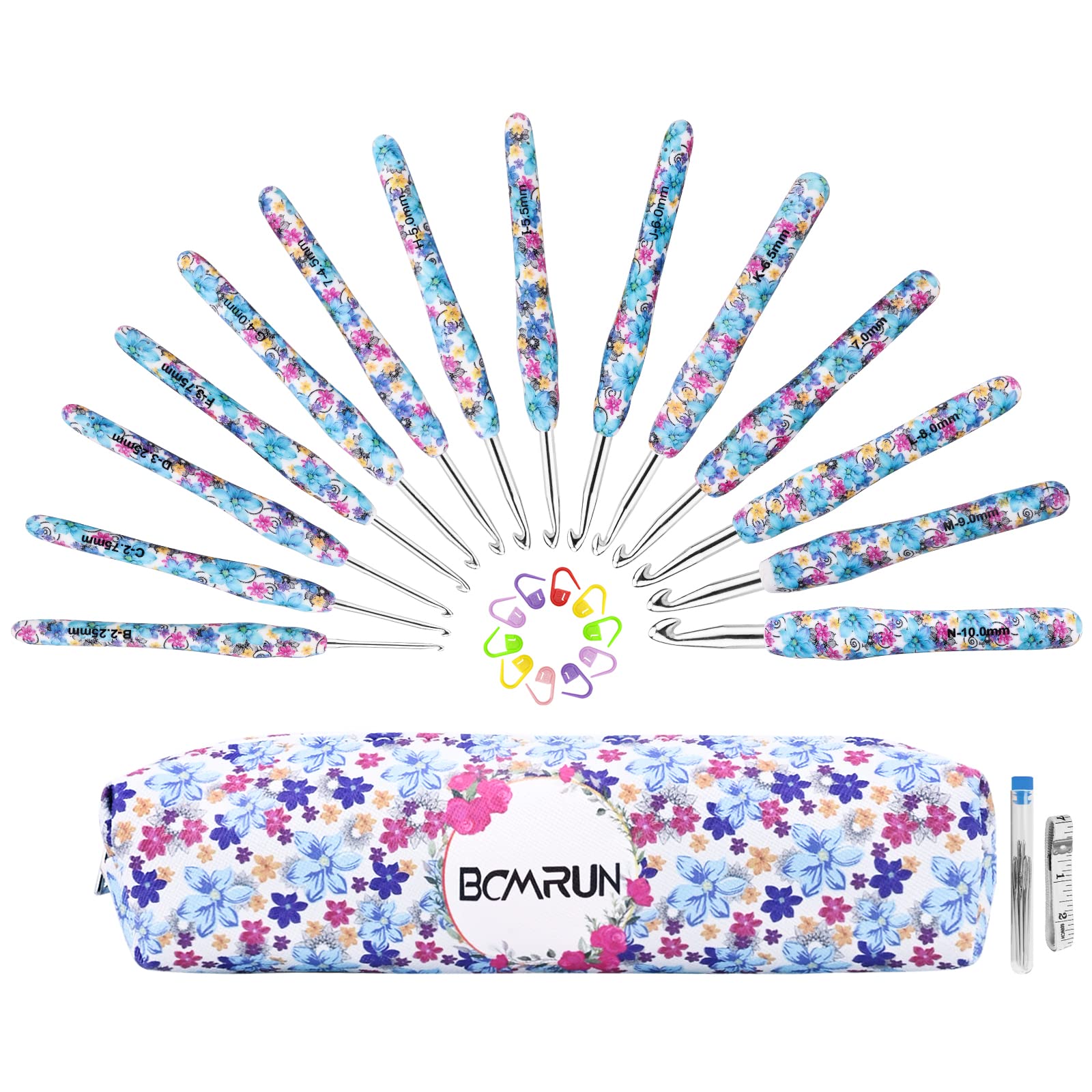- 【Flower Pattern Crochet Hooks Value Set】14 Size Ergonomic Decorative Flower Pattern Crochet Hooks Knitting Needles Set. , size ranges: B(2.25mm), C(2.75mm), D(3.25mm), F(3.75mm), G(4mm), 7(4.5mm), H(5mm), I(5.5mm), J(6mm),K(6.5mm), 7mm,L(8mm), M/N(9mm) and N/P(10mm). 10 Stitch Markers,9 Large-Eye Blunt Knitting Needles, 1 measure tape & 1 Floral crochet hooks Case. Enjoy the crocheting time with your family!